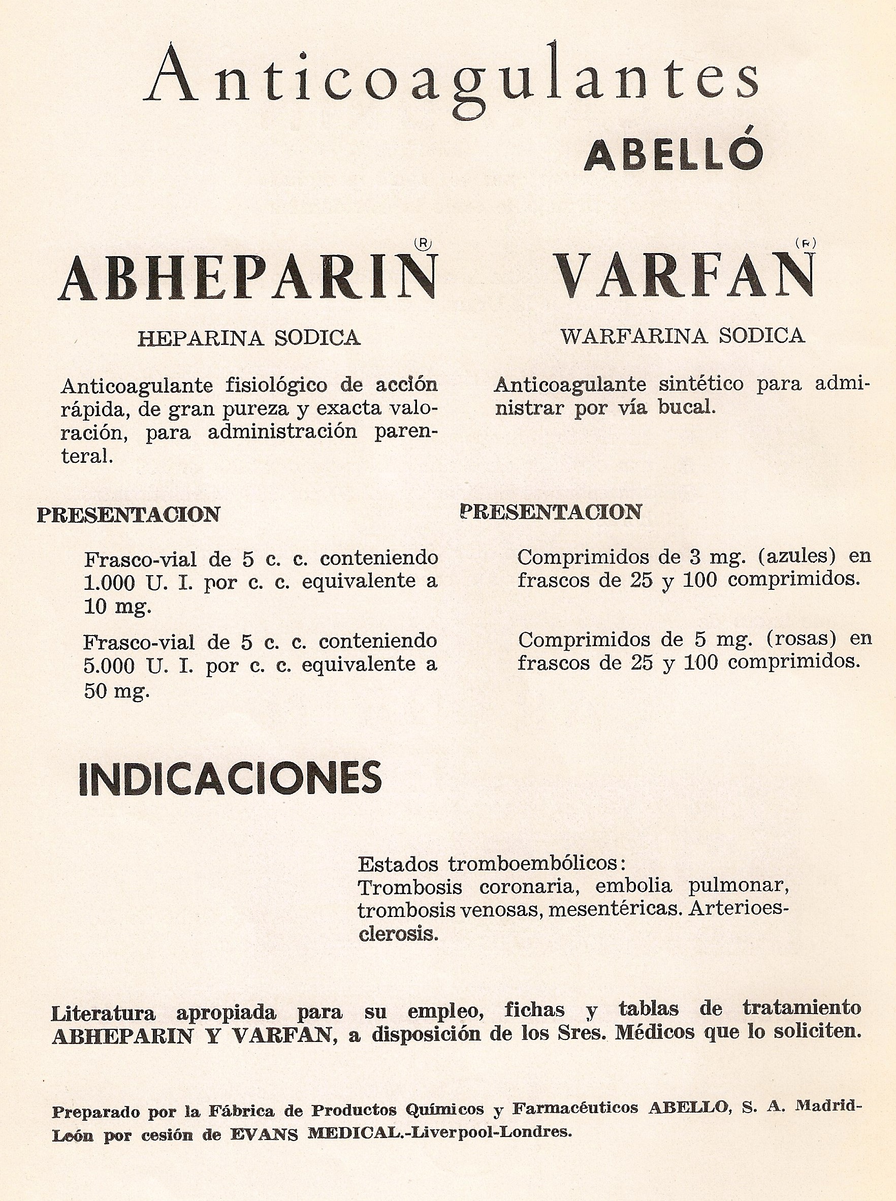 Abheparin. Varfan. Anticoagulantes, heparina sódica y warfarina sódica. 1966