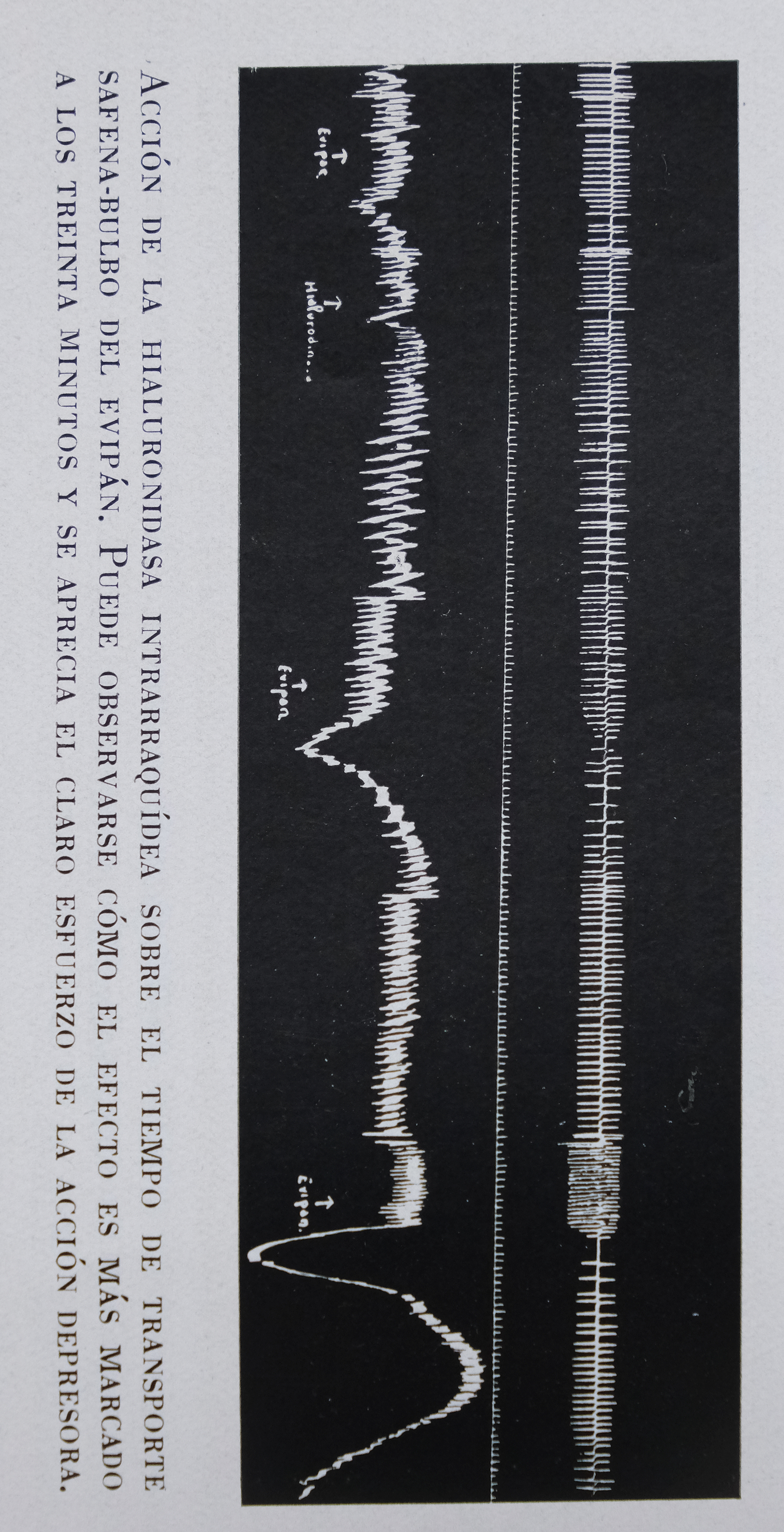 Acción de la hialuronidasa intrarraquídea sobre el tiempo de transporte safena-bulbo del evipán. Puede observarse cómo el efecto es más marcado a los treinta minutos y se aprecia el claro esfuerzo de la acción depresora.