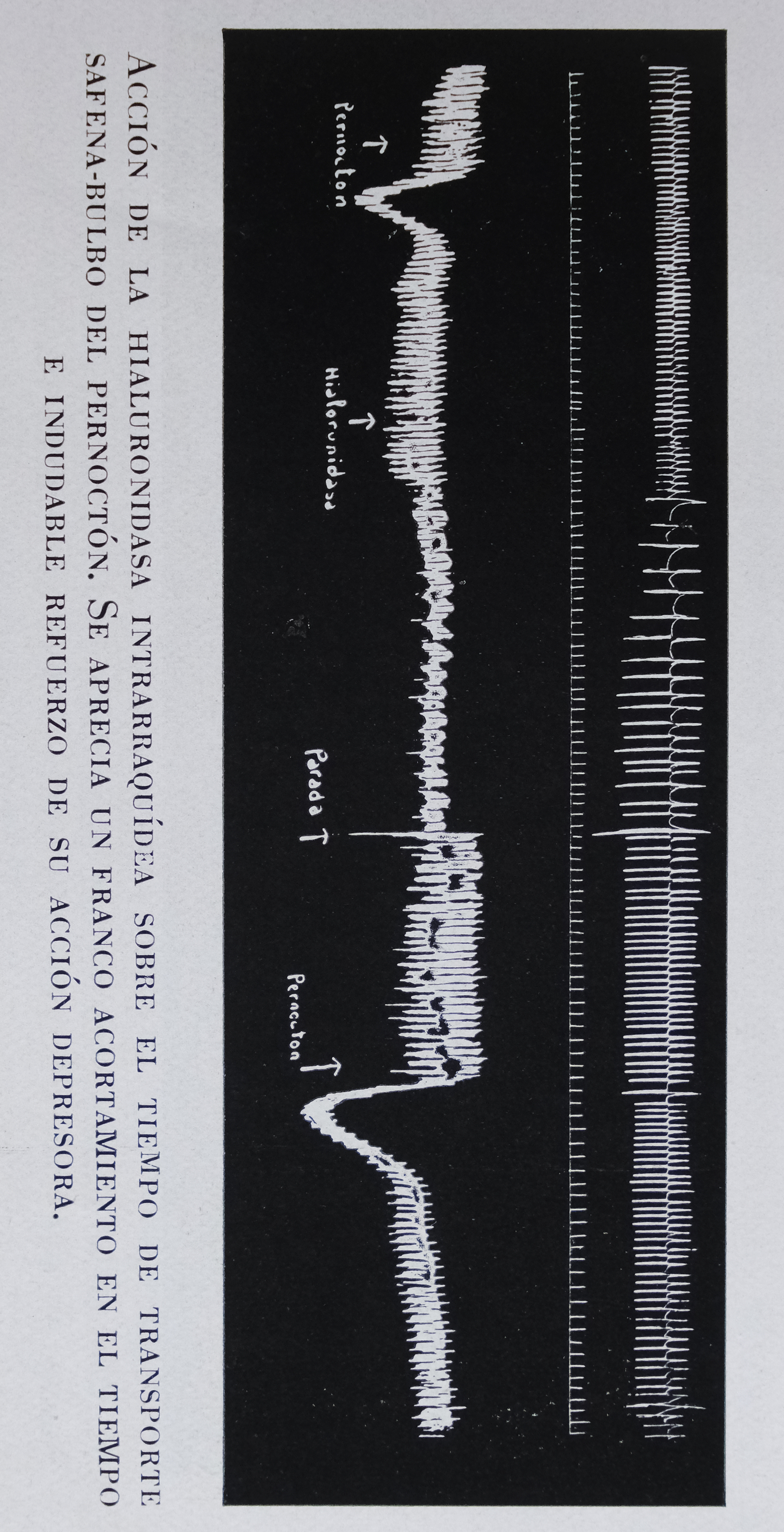 Acción de la hialuronidasa intrarraquídea sobre el tiempo de transporte safena-bulbo del pernoctón. Se aprecia un franco acortamiento en el tiempo e indudable refuerzo de su acción depresora.