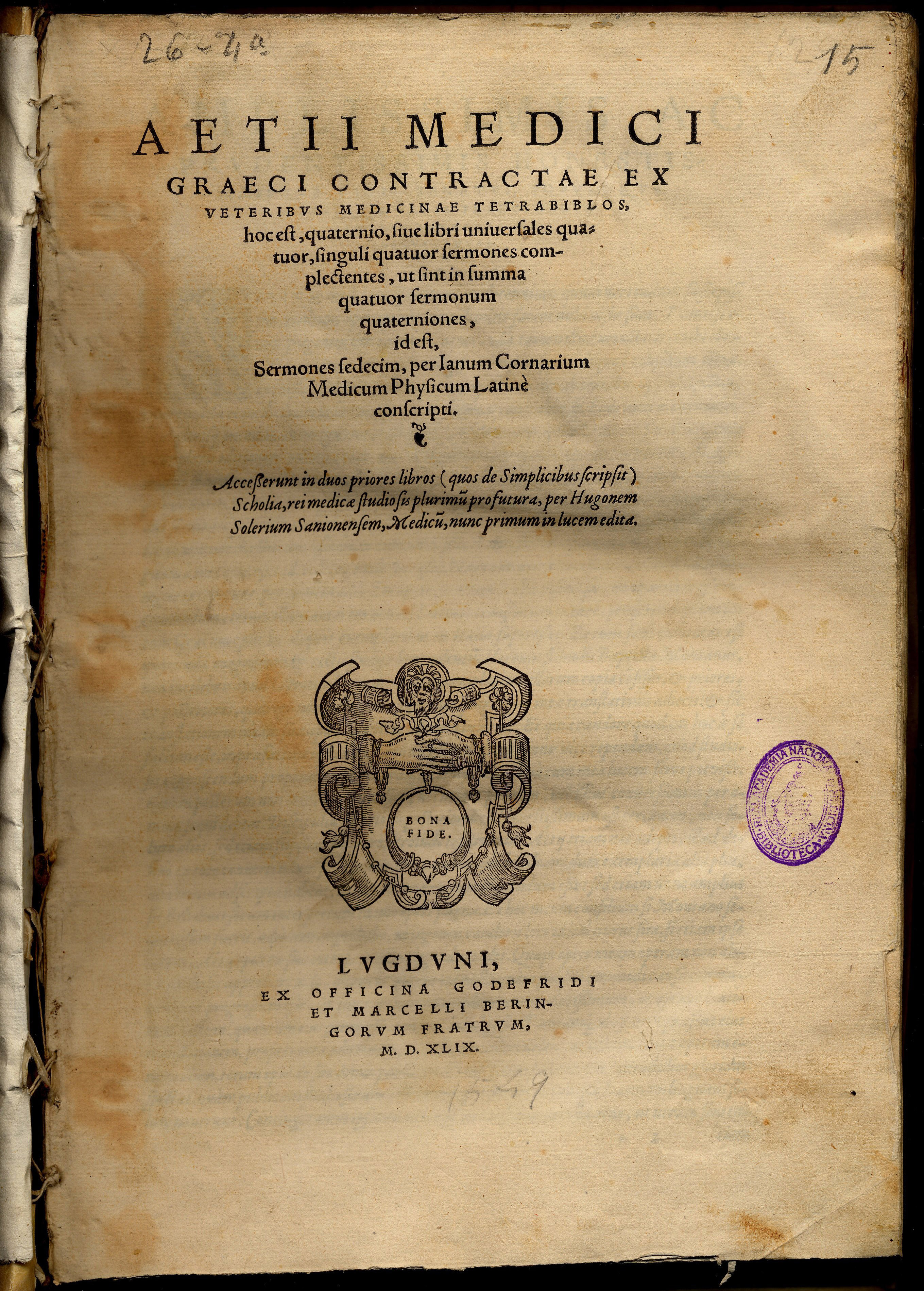 AECIO (s. V-s. VI). — Aetii (…) contractae ex veteribus medicinae tetrabiblos (…). — Lugduni : ex officina Godefridi et Marcelli Beringorum, 1549. — [8] p., 1031 col. ; fol. (32 cm). – Perg