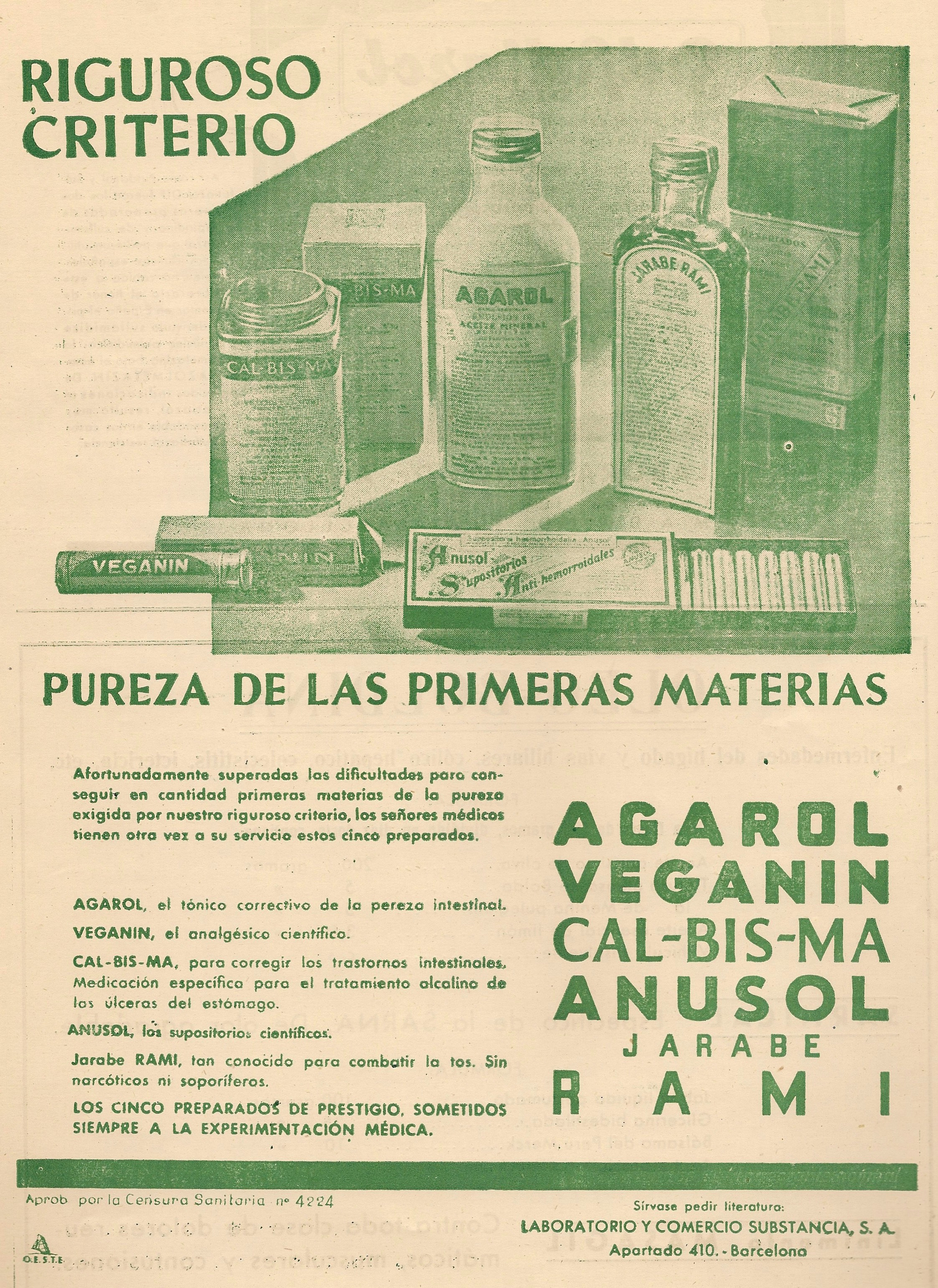 Agarol, Veganín, Cal-Bis-Ma, Anusol. Laboratorio y Comercio Substancia S.A. Barcelona. Publicidad aparecida en la revista Gaceta Médica Española, año XIX, número 5. 1945.