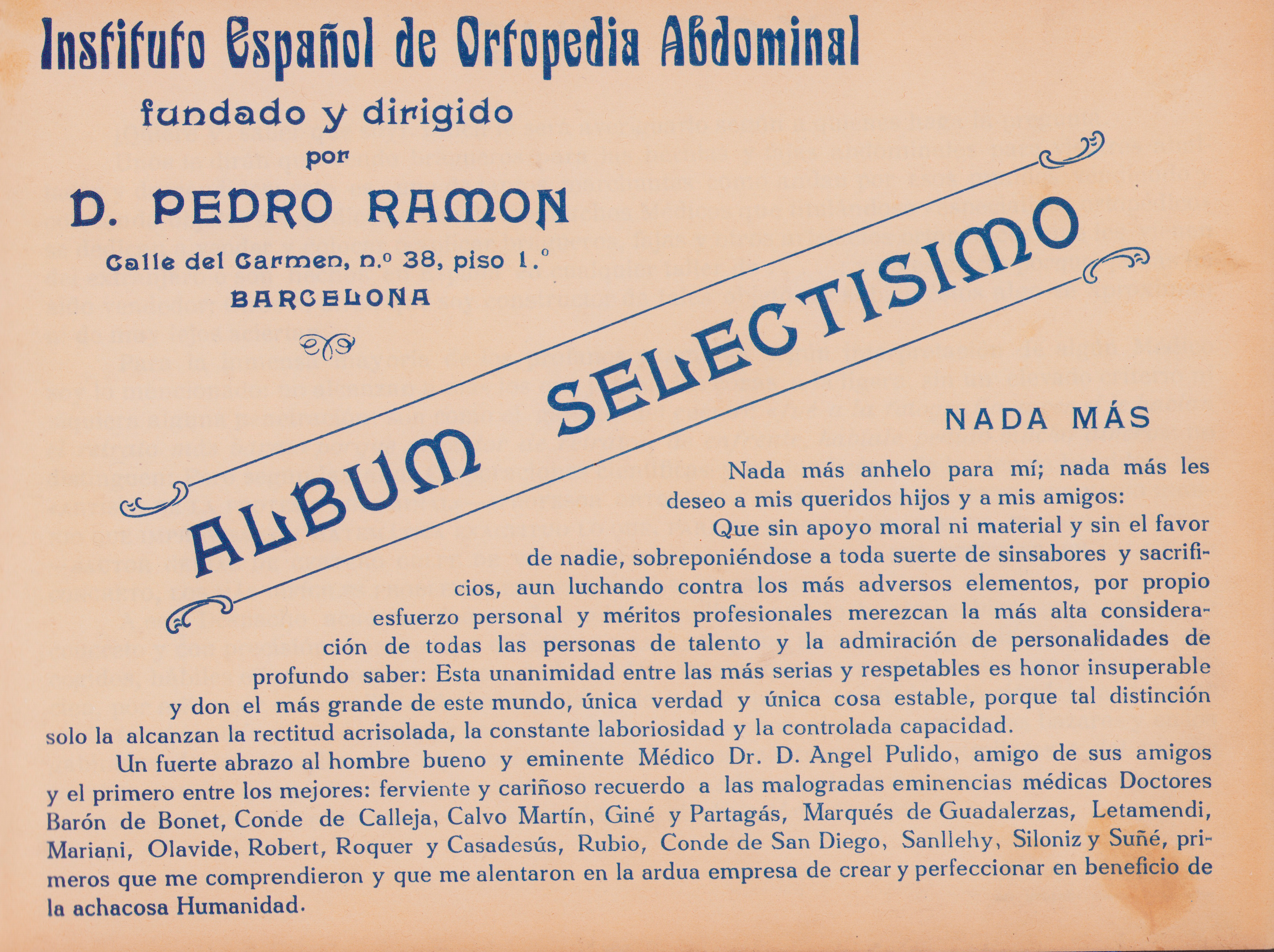 Un fuerte abrazo al hombre bueno y eminente Médico Dr. D. Angel Pulido, amigo de sus amigos y el primero entre los mejores: ferviente y cariñoso recuerdo a las malogradas eminencias médicas Doctores Barón de Bonet, Conde de Calleja, Calvo Martín, Giné y Partagás, Marqués de Guadalerzas, Letamendi, Mariani, Olavide, Robert, Roquer y Casadesús, Rubio, Conde de San Diego, Sanllehy, Siloniz y Suñé, primeros que me comprendieron y que me alentaron en la ardua empresa de crear y perfeccionar en beneficio de la achacosa Humanidad.