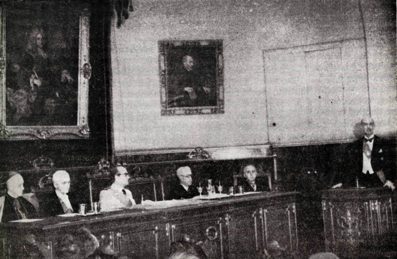 El Profesor Enríquez de Salamanca, pronunciando su discurso de bienvenida al Profesor Alexander Fleming, acto que preside el Ministro de Educación Nacional, señor Ibáñez Martín acompañado del nuevo Académico de Honor Extranjero de la Real Academia Nacional de Medicna y del Patriarca y Obispo de Madrid-Alcalá (ambos a la izquierda), y de los profesores Casares Gil y Matilla (a la derecha).13 de Junio de 1948.