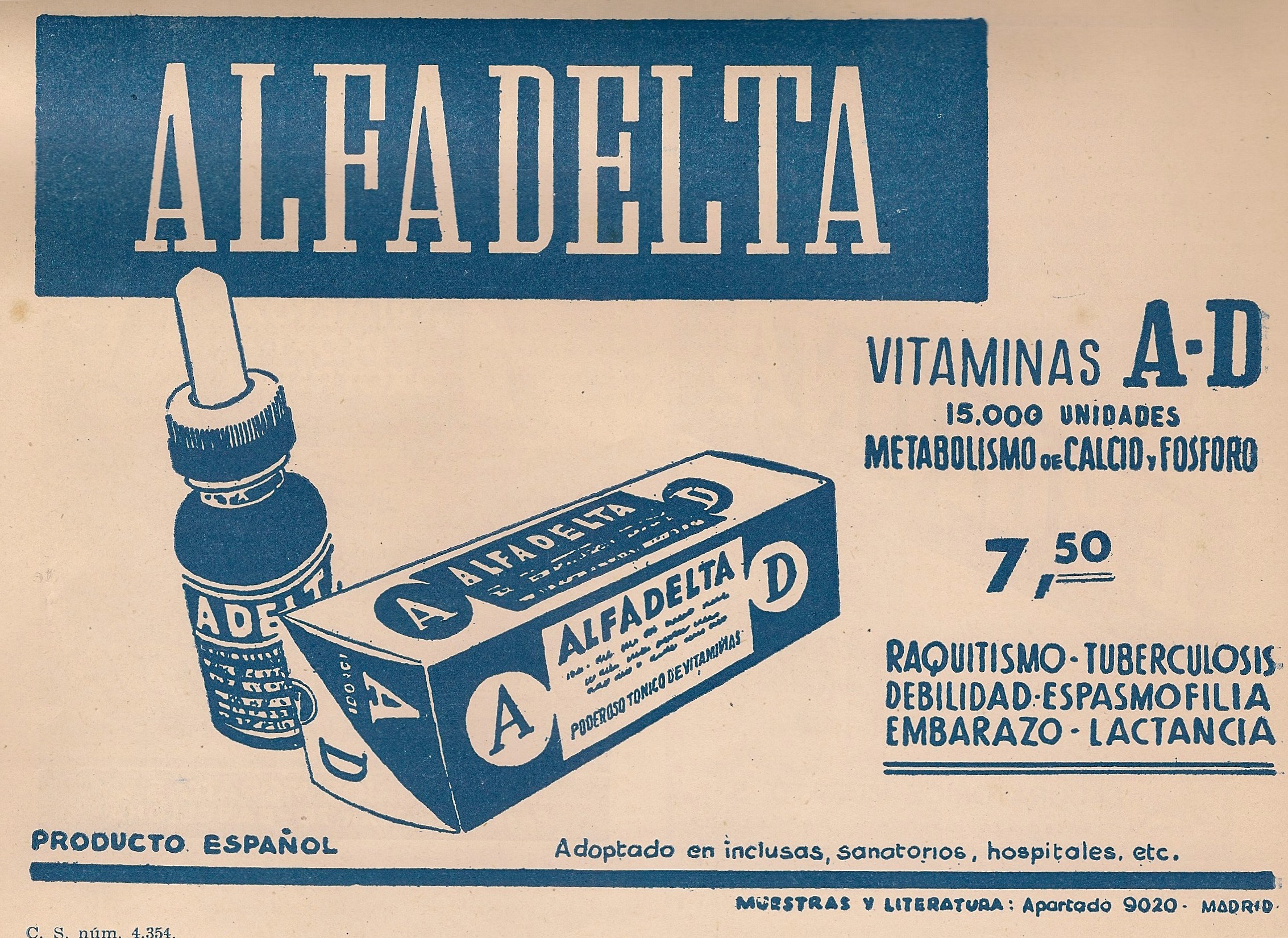 Alfadelta. Vitaminas A y D. Metabolismo de calcio y fosforo. Raquitismo, tuberculosis, debilidad, espasmofília, embarazo, lactancia. Publicidad aparecida en la revista Gaceta Médica Española. Año 18, número 2, 1944.