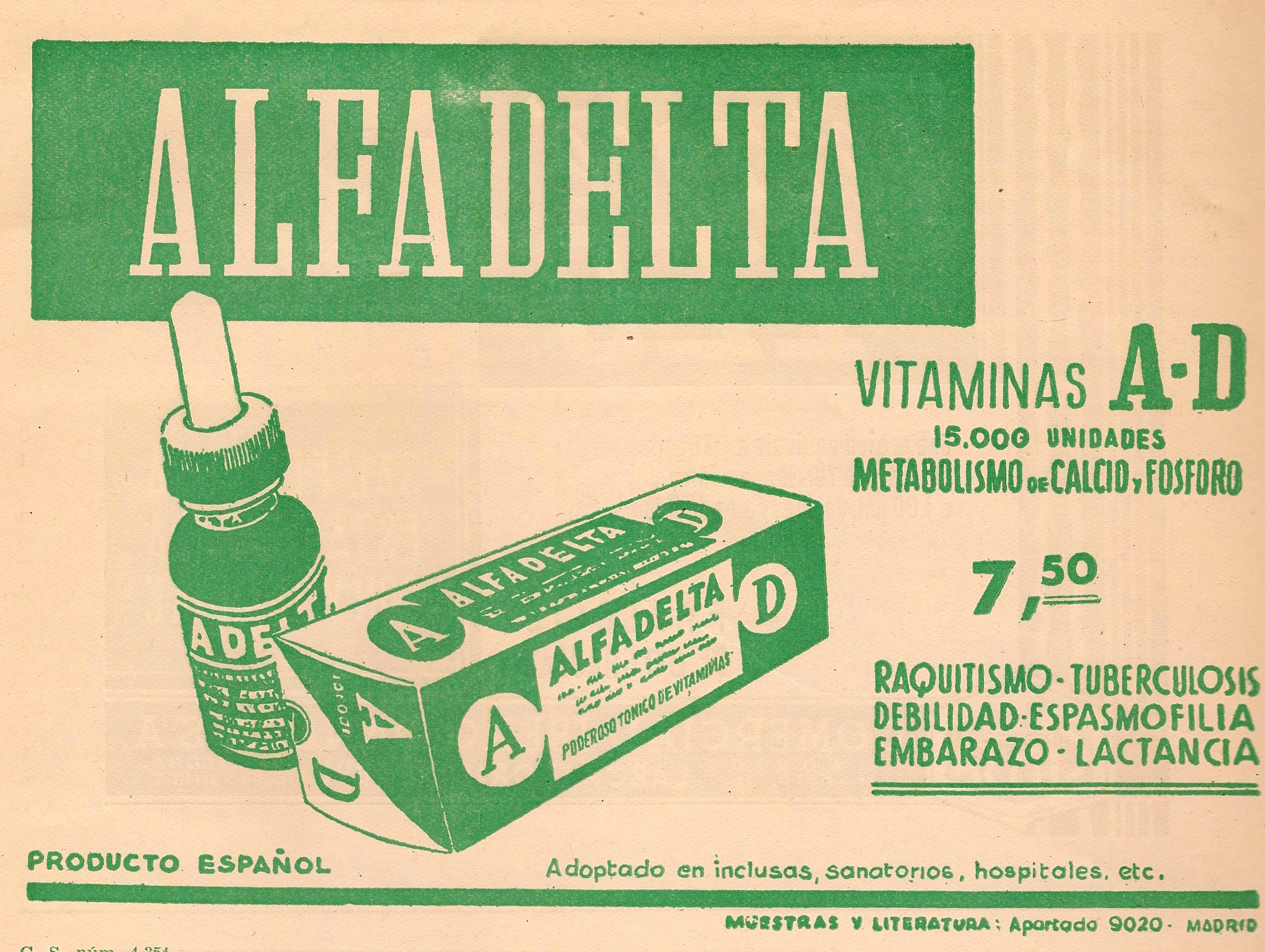 Alfadelta. Vitaminas A y D. Metabolismo de calcio y fósforo. Raquitismo, tuberculosis, debilidad, espasmofília, embarazo, lactancia. Publicidad aparecida en la revista Gaceta Médica Española. Año 18, número 2, 1944.