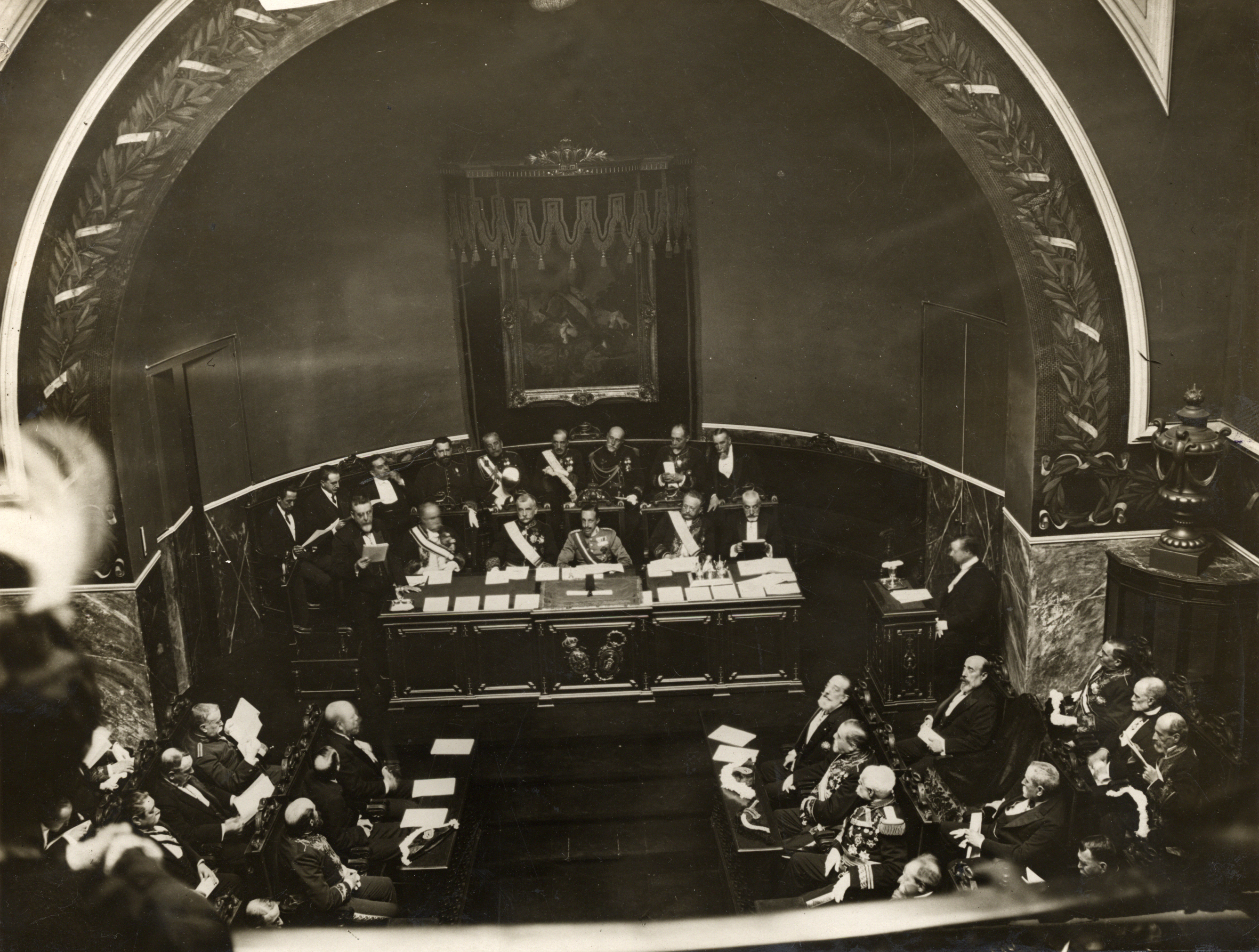 El Solemne acto de recepción como nuevo académico de número de la Real Academia Nacional de Medicina del Prof. Manuel Márquez y Rodríguez, contó con la Presidencia de Su Majestad el Rey Alfonso XIII el día 14 de Mayo de 1916. Le acompañaron en la mesa Presidencial, a su izquierda, los Profesores Cortezo (Presidente de la Corporación) y Pulido; a su derecha, los Profesores Amalio Gimeno y Cortejarena. Archivo de la Real Academia Nacional de Medicina.