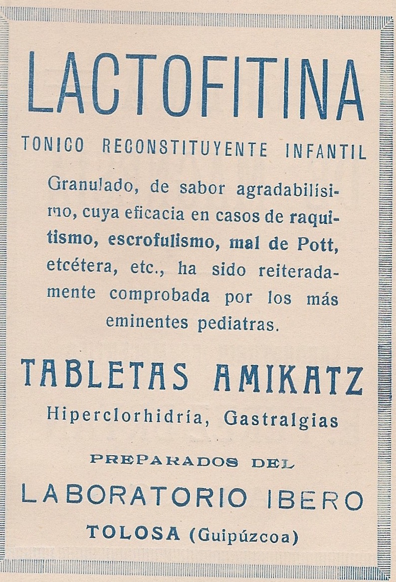 Lactofilina. Reconstituyente infantil. Gastaríais, hiperclorhidria. Laboratorio Ibero. Golosa, Guipúzcoa.Publicidad aparecida en Gaceta Médica Española. Año 1, número 12, 1927