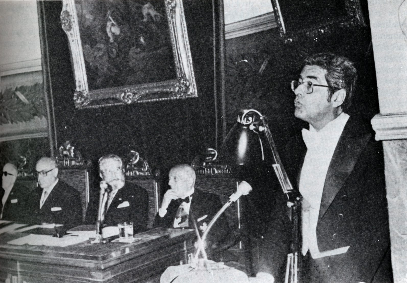 El Prof. Francisco Alonso Fernández pronunciando su discurso de ingreso como nuevo Académico de Número de la Real Academia Nacional de Medicina. Presidió el acto el Excmo. Sr. Ministro de Cultura, D. Manuel Clavero Arévalo, acompañado a su izquierda por el Rector de la Universidad Complutense, Prof. Vian Ortuño, y Valentín Matilla, Secretario Perpetuo de la Academia.