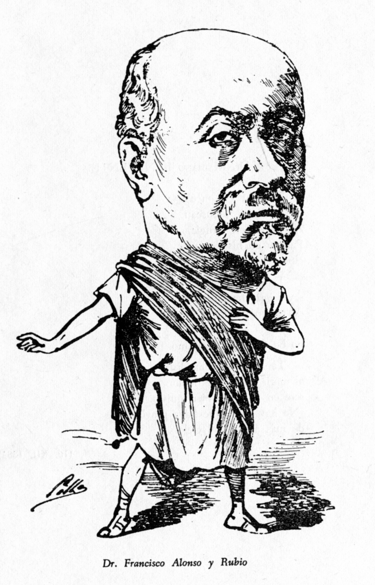 Caricatura del Dr. D. Francisco Alonso y Rubio (1813 – 1894), por Cilla, sacada del libro del Prof. D. Luís Sánchez Granjel, ‘Biografía de “El Dr. Sangredo” (1883-1884)’, que fue una revista médica del siglo XIX que se subtitulaba “Revista satírica quincenal. Dedicada a los hijos de Esculapio”. Pag. 53.