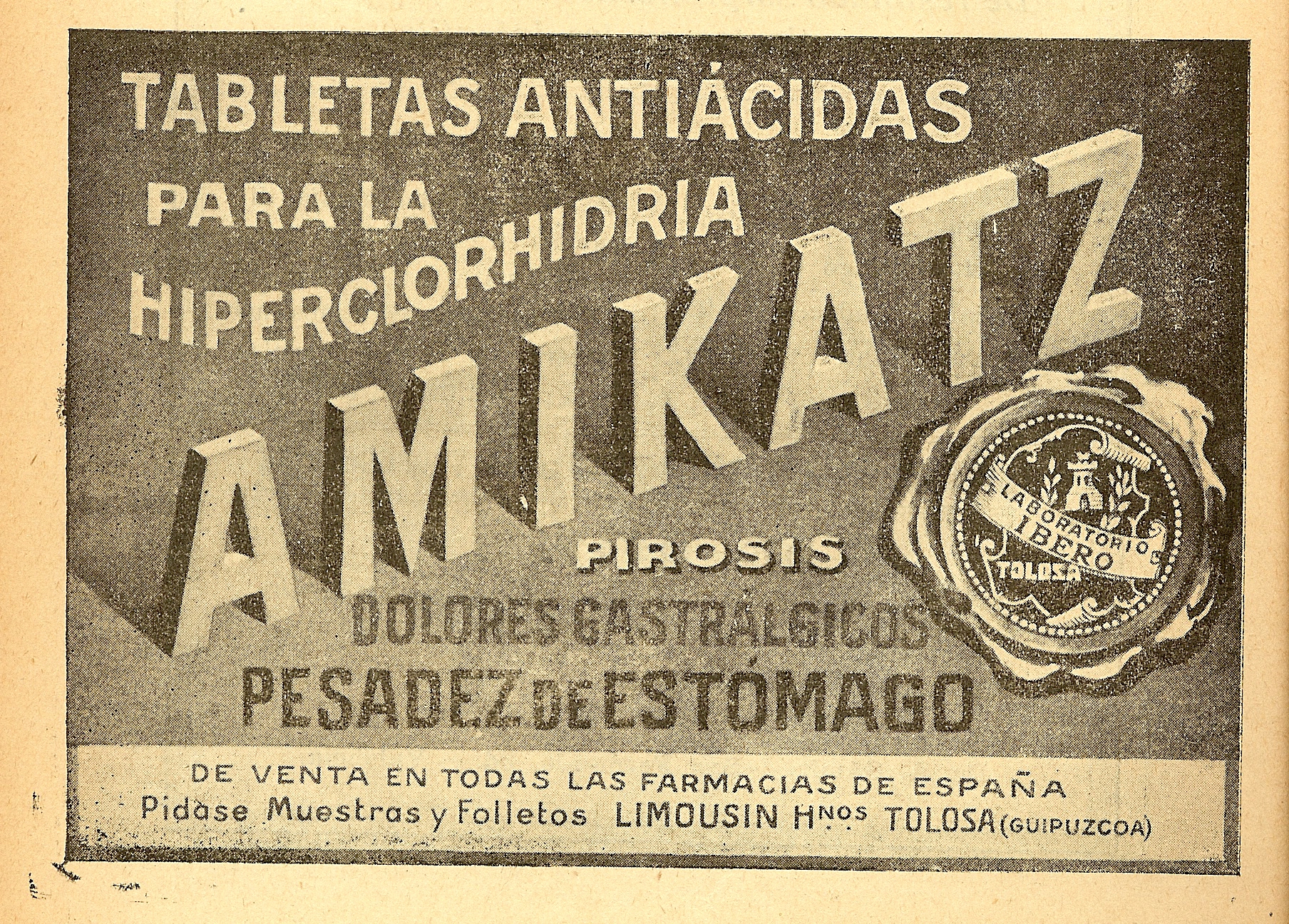Amikatz. Tabletas antiácidas. Publicidad frecuente en revistas. 1918.