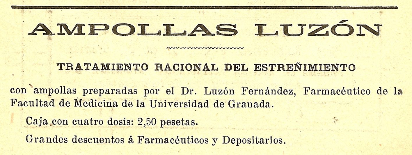 Ampollas Luzón. Tratamiento racional del estreñimiento. Publicidad frecuente en revistas. 1918.