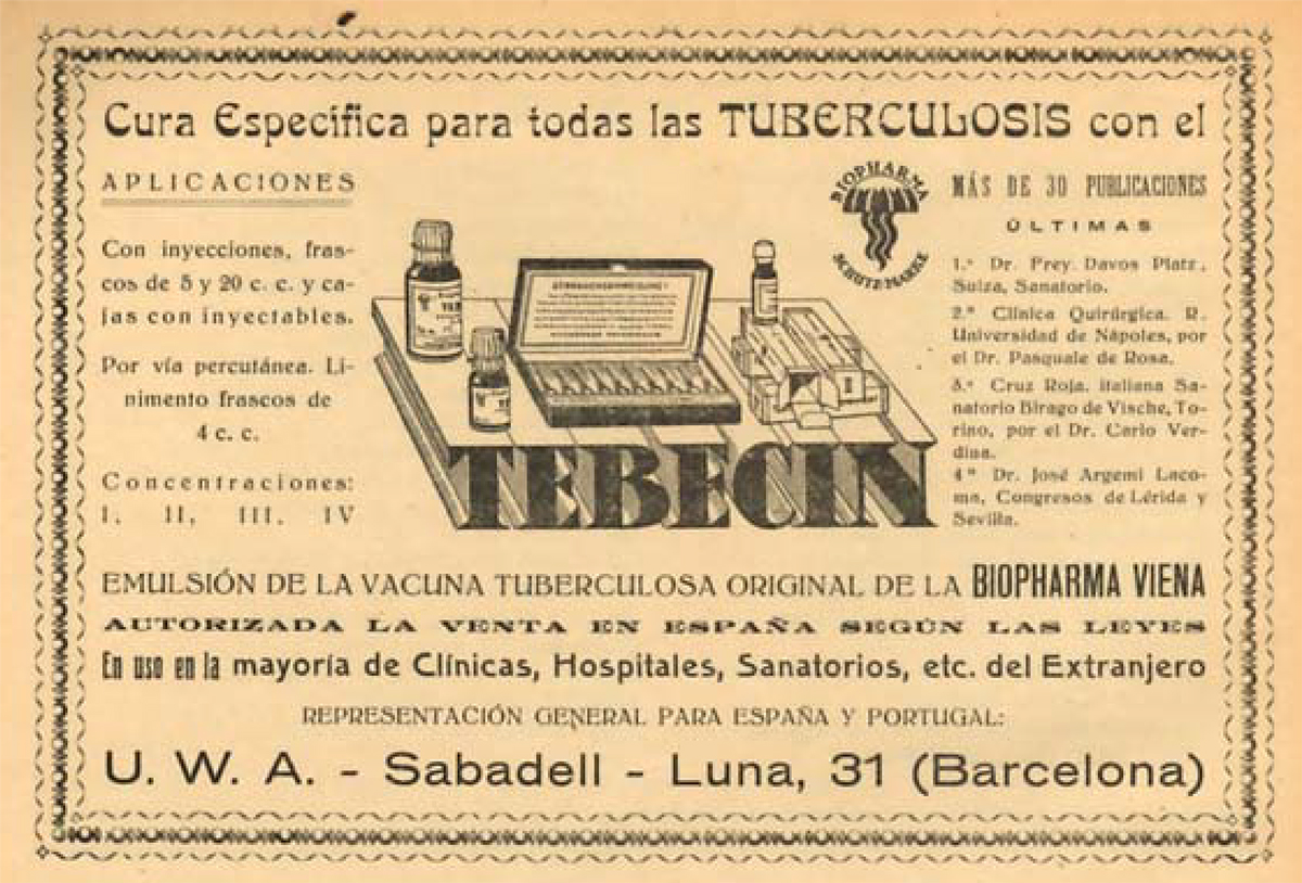 Anuncio TEBECIN publicado en el año 1911, en la revista científica Actualidad Médica (editada por la Real Academia de Medicina de Andalucía Oriental).