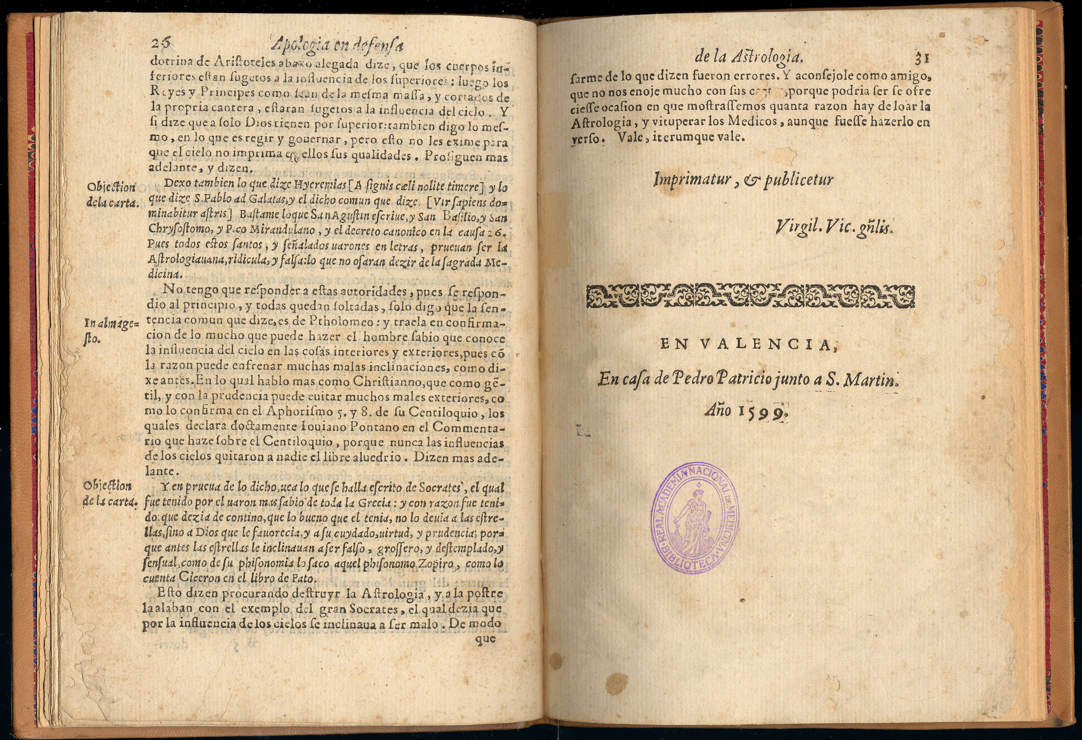 LEDESMA, Manuel. – Apología en defensa de la astrología — En Valencia : en casa de Pedro Patricio […], 1599. — 31 p. ; 4º [20 cm.]. – Piel.