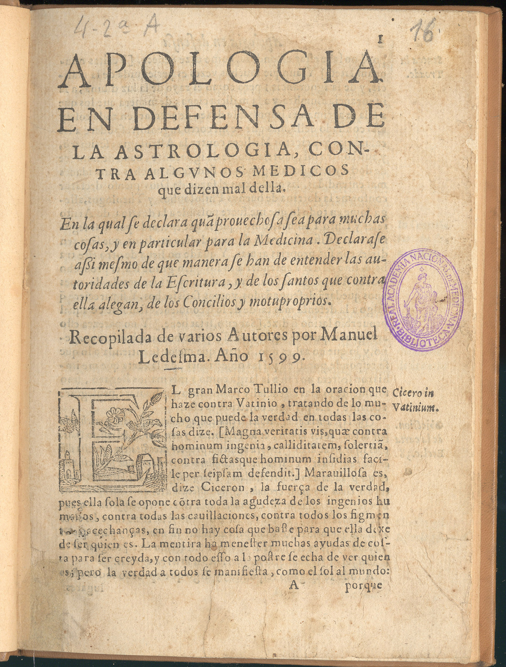 LEDESMA, Manuel. – Apología en defensa de la astrología — En Valencia : en casa de Pedro Patricio […], 1599. — 31 p. ; 4º [20 cm.]. – Piel.