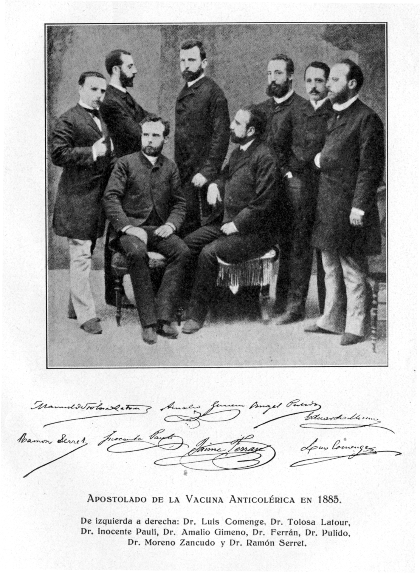 De izquierda a derecha : Dr. Luis Comenge, Dr. Tolosa Latour, Dr. Inocente Pauli, Dr. Amalio Gimeno, Dr. Ferrán, Dr. Pulido, Dr. Moreno Zancudo y Dr. Ramón Serret. Fuente: Trabajos de la Cátedra de Historia Crítica de Medicina 1934-35
