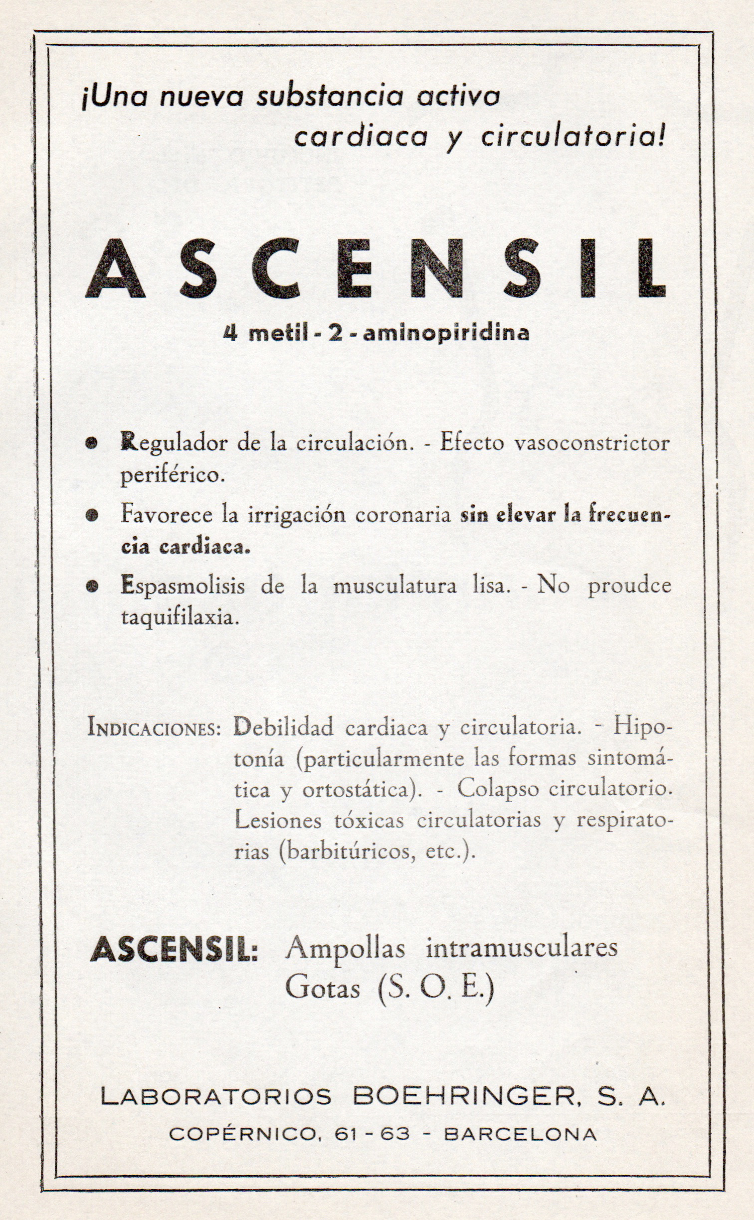 Ascensil. Regulador de la circulación. Laboratorios Boehringer, S.A.., Barcelona. Hispalis Médica, Diciembre 1960
