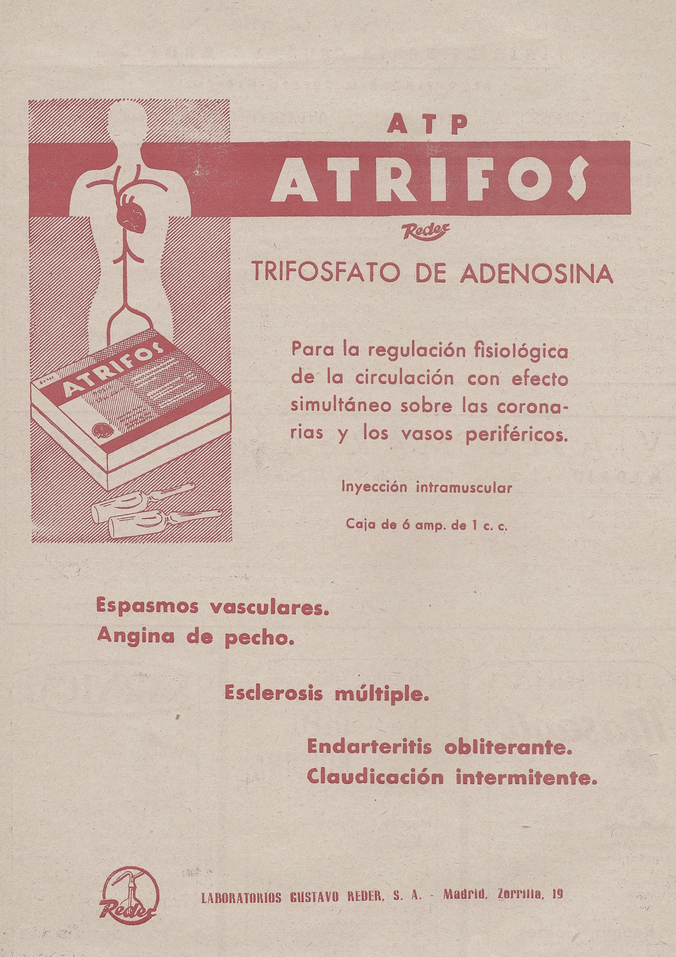 Atrifos. Trofosfato de adenosina. Espasmos vasculares, angina de pecho, esclerosis múltiple, endarteritis obliteran, claudicación intermitente. Laboratorios Gustavo Reder. Madrid. Publicidad aparecida en Gaceta Médica Española. Noviembre 1953, año XXVII, número 11.