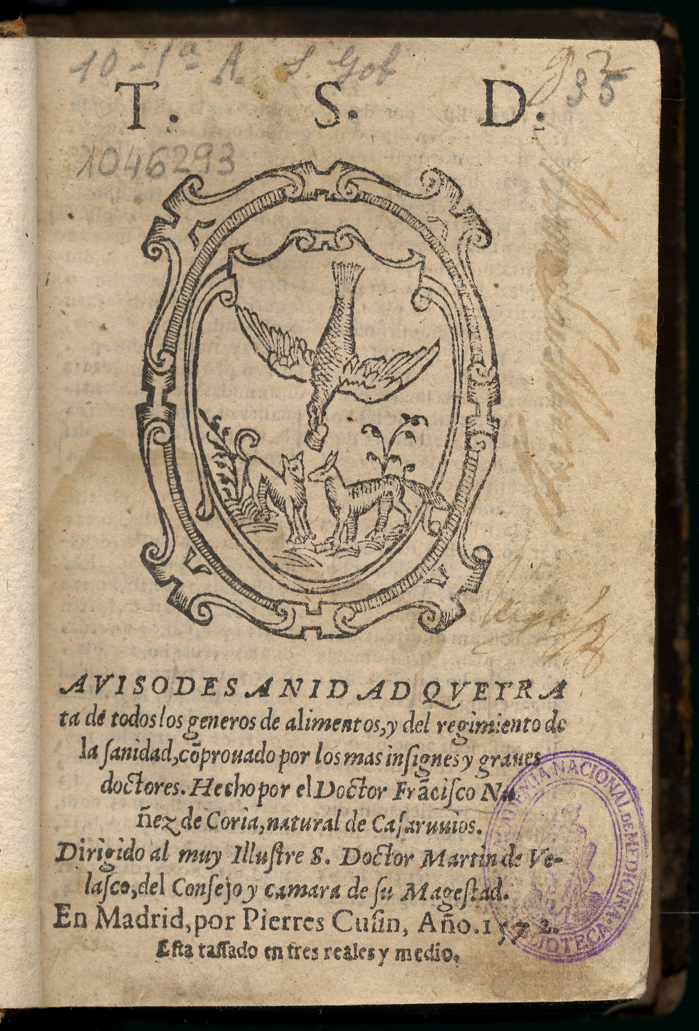 NÚÑEZ DE ORIA, Francisco. — Aviso de sanidad… — En Madrid : por Pierres Cusin, 1572. — [18], 320 h. ; 8º (15 cm). – Pasta