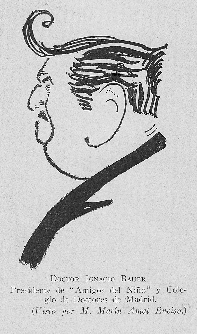 Bauer y Landauer, Ignacio. Presidente de Amigos del Niño y Colegio de Doctores de Madrid. Caricatura de M.Marín Amat Enciso. Gaceta Médica Española, marzo, 1928