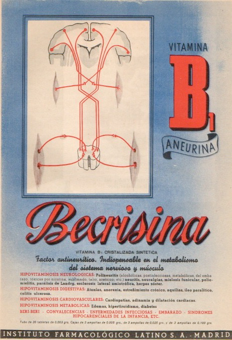 Becrisina. Vitamina B1, aneurina. Factor abntineurítico. Instituto Farmacologico Latino S.A., Madrid. Medicamente, 1 de diciembre de 1947.
