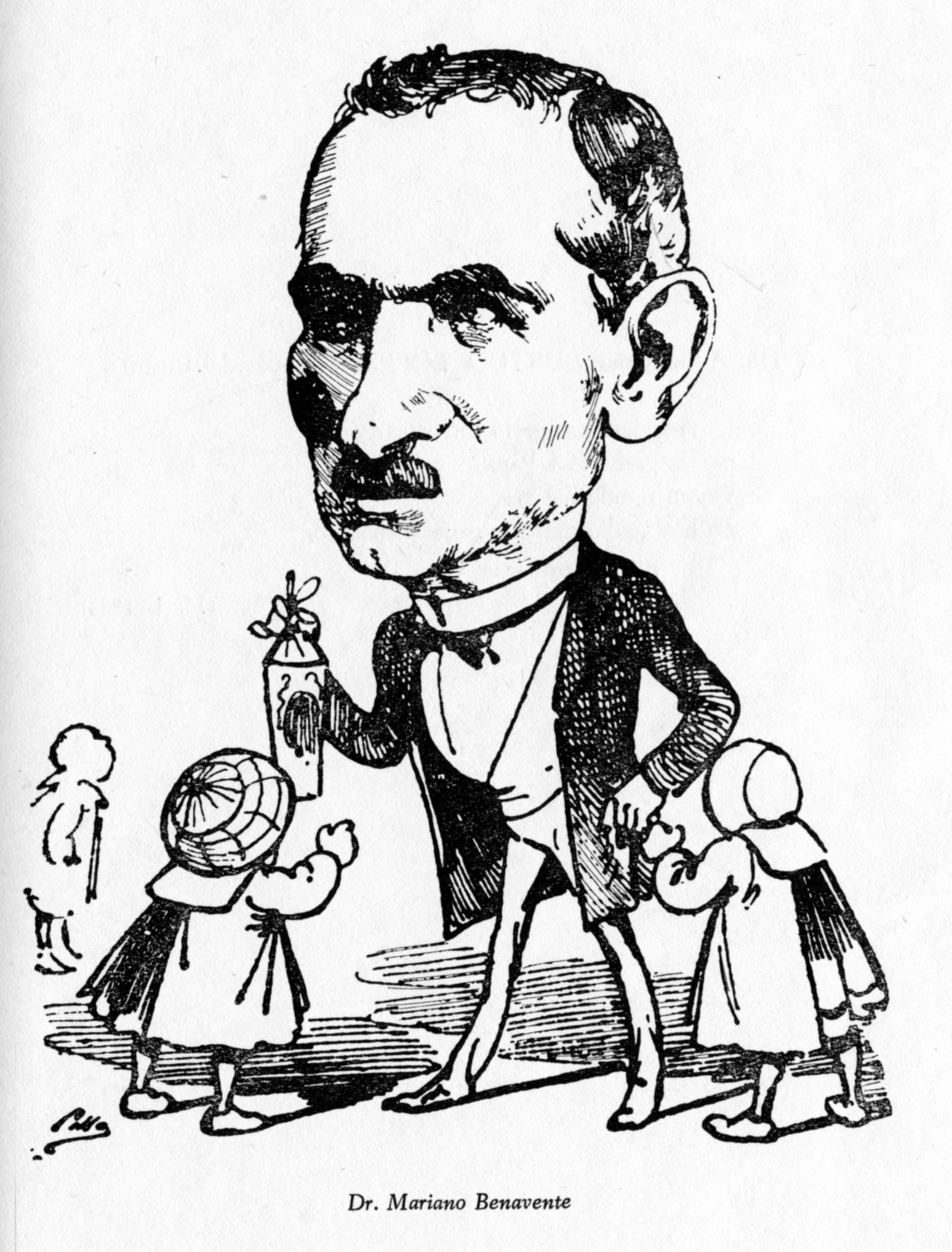 Caricatura del Dr. D.Mariano Benavente González (1818 – 1885), por Cilla, sacada del libro del Prof. D. Luís Sánchez Granjel, ‘Biografía de “El Dr. Sangredo” (1883-1884)’, que fue una revista médica del siglo XIX que se subtitulaba “Revista satírica quincenal. Dedicada a los hijos de Esculapio”. Pag. 55.