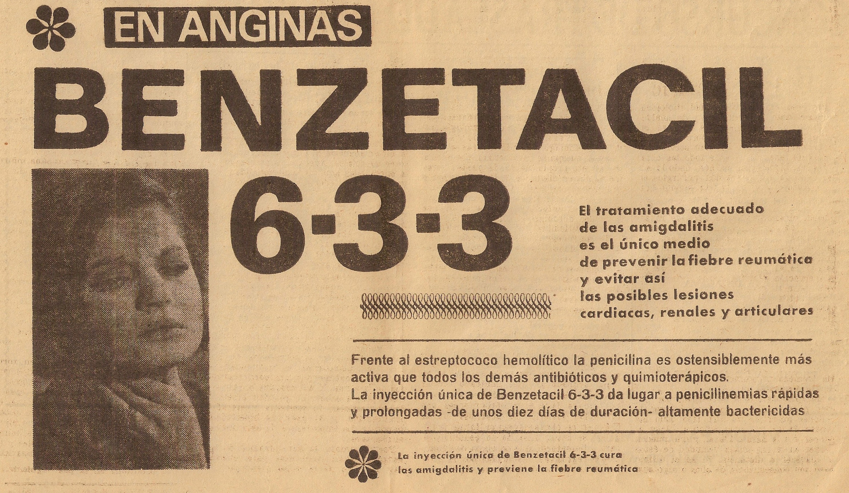 Benzetacil. Penicilina, el tratamiento adecuado de las amigdalitis. Tribuna Médica, 6 de enero de 1967. Publicado por Antibióticos, S.A