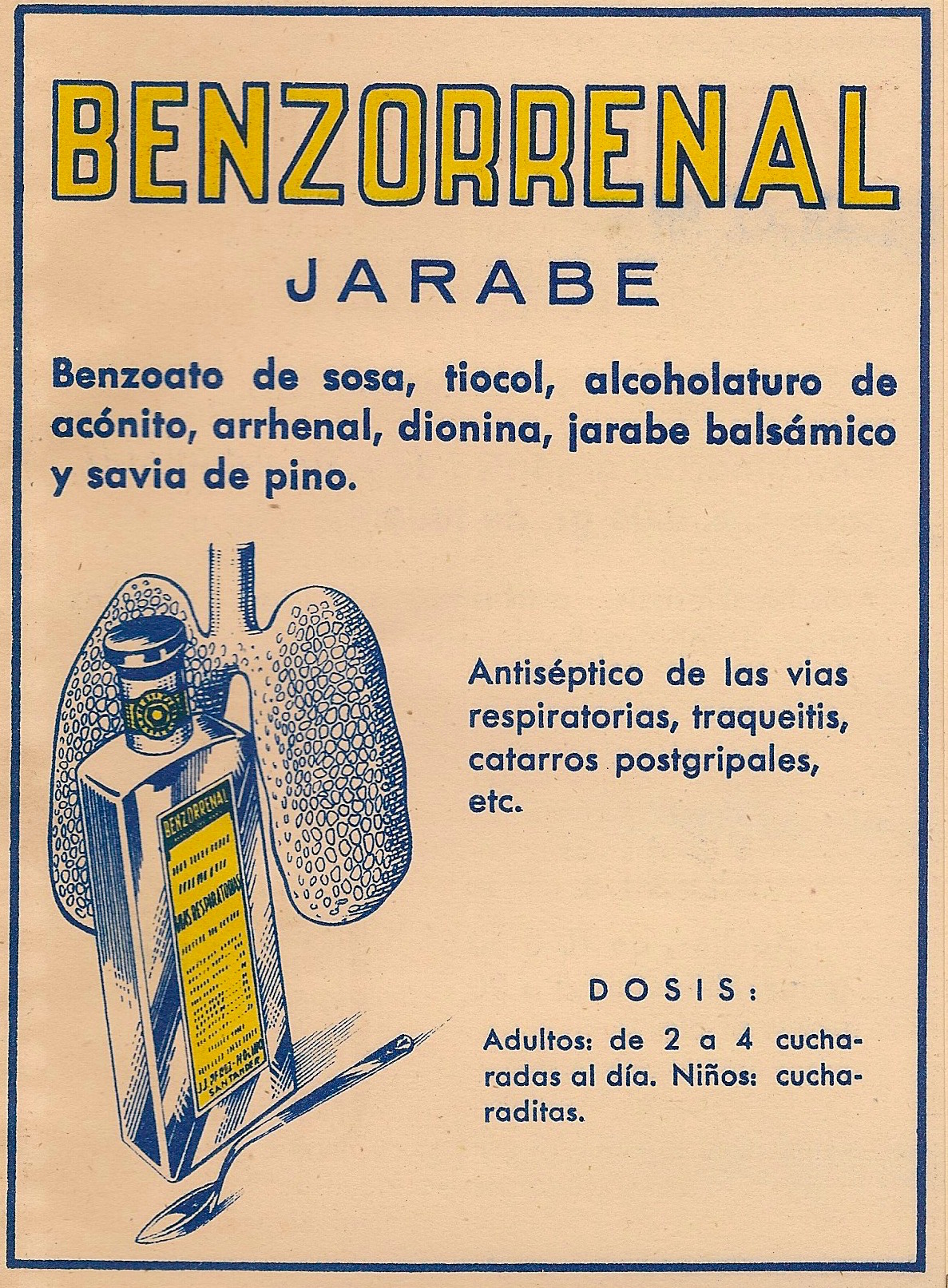Benzorrenal. Benzoato de sosa, tiocol, alcoholaturo de acónito, arrhenal, dionina, jarabe balsámico y savia de pino. Antiséptico de las vías respiratorias, traqueítis, catarros. Industrial Farmacéutica Cantabria S.A. Santander. Encarte publicitario aparecido en la revista Gaceta Médica Española. Año 18, número 2, 1944.