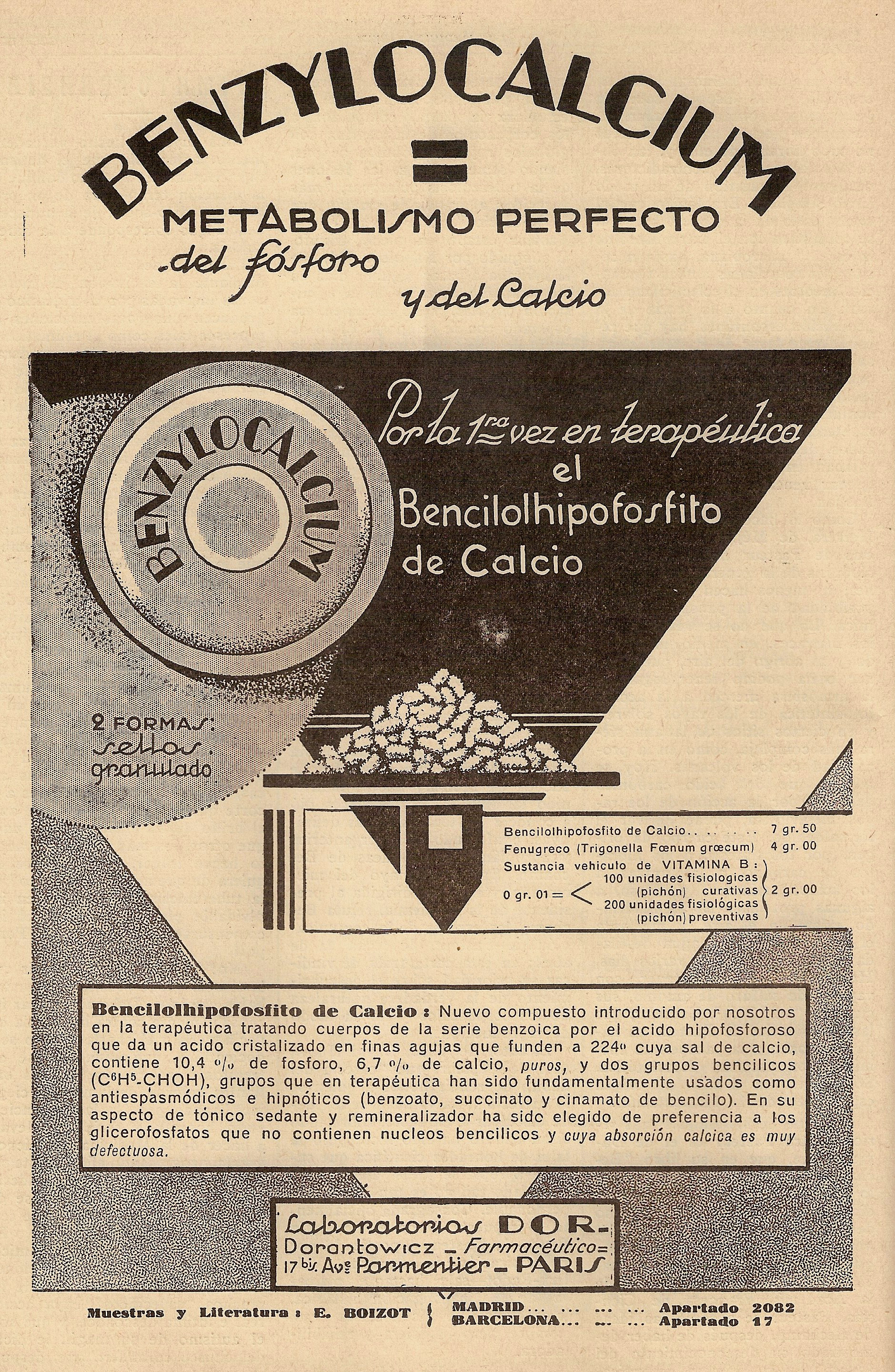 Benzylocalcium. Bencilohipofosfito de calcio.La Medicina Íbera, 11 de abril de 1931Metabolismo perfecto del fósforo y del calcio. La Medicina Íbera, 11 de abril de 1931
