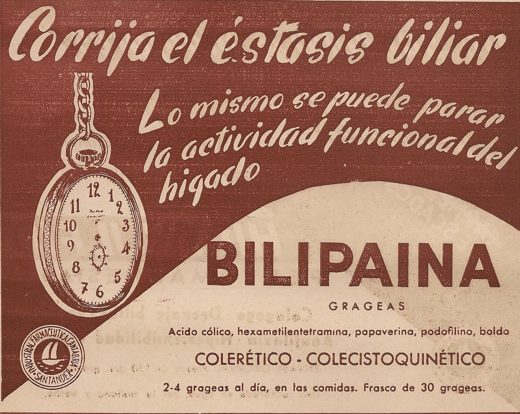 Bilipaina. Estasi biliar. Colerético, Colecistoquinñetico. Industrial Farmacéutica Cantabria. Santander. Encarte publicitario aparecido en Gaceta Médica Española. Noviembre 1953, año XXVII, número 11.