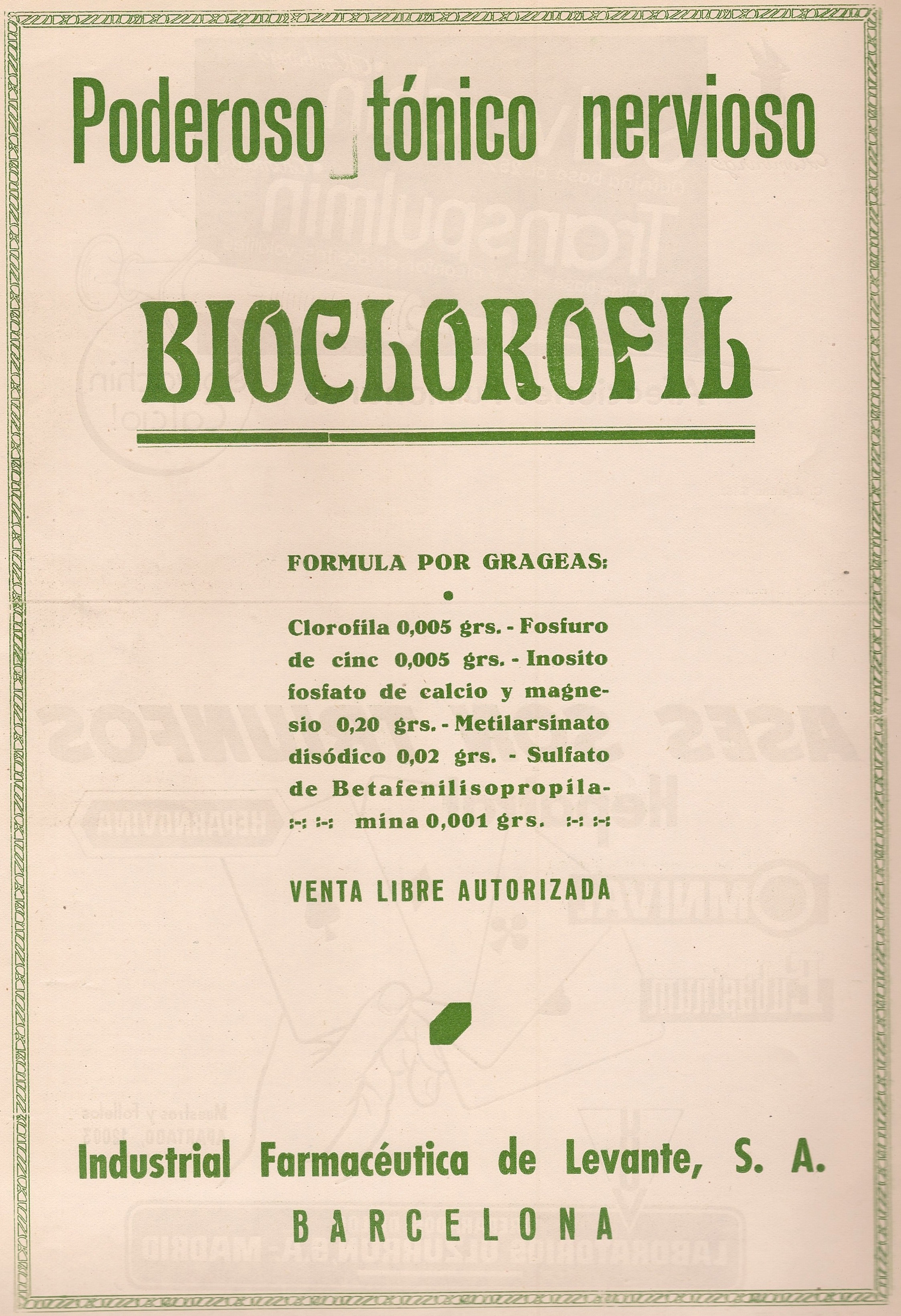 Bioclorofil. Clorofila, fosfuro de zinc, inosito fosfato de calcio y magnesio, metilarsinato disódico, sulfato de betaienilisopropilamina. Tónico nervioso. Grageas. Industrial Farmacéutica de Levante SA. Barcelona. Publicidad aparecida en la revista Gaceta Médica Española. Año 18, número 4, 1944.