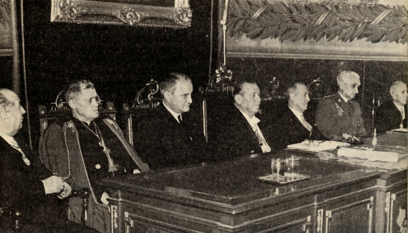 Mesa presidencial del acro de recepción como Académico de Número de la Real academia Nacional de Medicina del Prof. Carlos Blanco Soler. En el centro, el Presidente de la Corporación, Prof. Palanca; a ambos lados de este, los Ministros de Asuntos Exteriores, Sr. Castiella, y de Trabajo, Sr. Sanz; en la izquierda, el Excmo. Sr. Arzobispo de Sión, Dr. Alonso Muñoyerro, y el Vicepresidente de la Academia, Dr. Carro; a la derecha, El Inspector General de la Cruz Roja, Excmo. Sr. D. Juan José Aracama, y el Secretario Perpetuo de la Academia, Prof. Matilla. 21 de Noviembre de 1961.