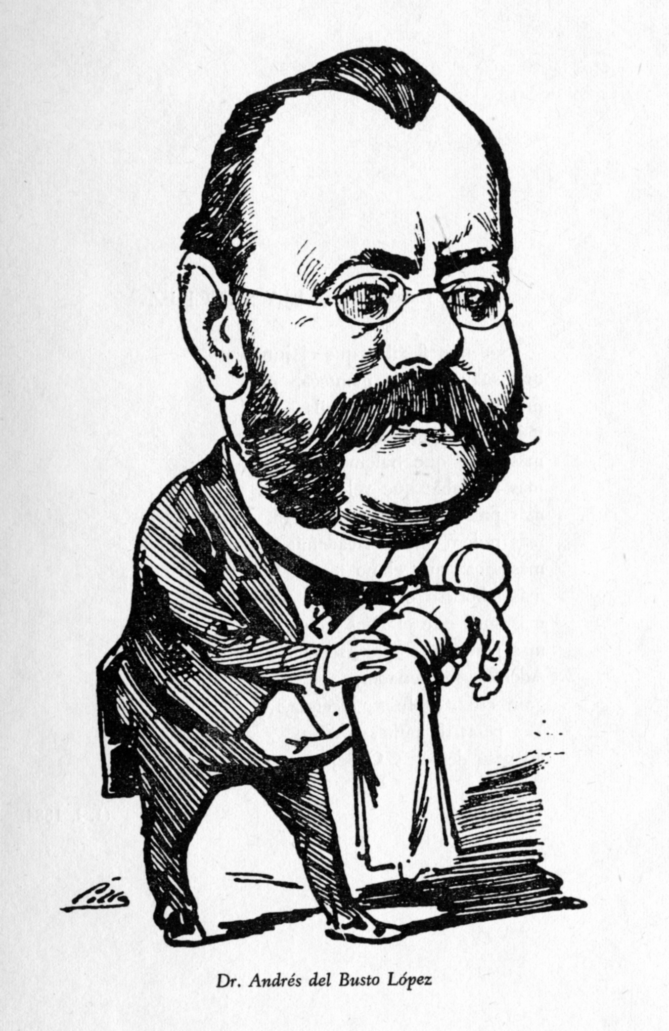 Caricatura del Dr. D. Andrés del Busto López, por Cilla, sacada del libro del Prof. D. Luís Sánchez Granjel, ‘Biografía de “El Dr. Sangredo” (1883-1884)’, que fue una revista médica del siglo XIX que se subtitulaba “Revista satírica quincenal. Dedicada a los hijos de Esculapio”. Pag. 57.
