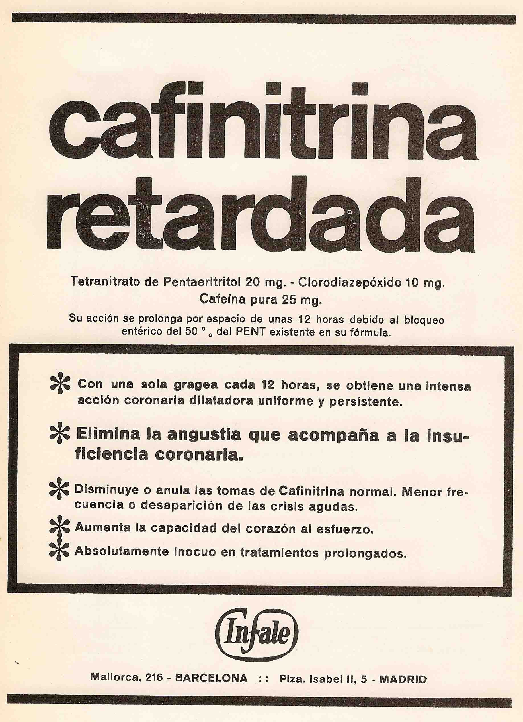 Cafinitrina retardada. Tetranitrato de pentaeritritol, clordiazepoxido, cafeina. Elimina la angustia que acompaña a la insuficiencia coronaria. INFALE, Barcelona. Revista Española de Cardiología 1966.