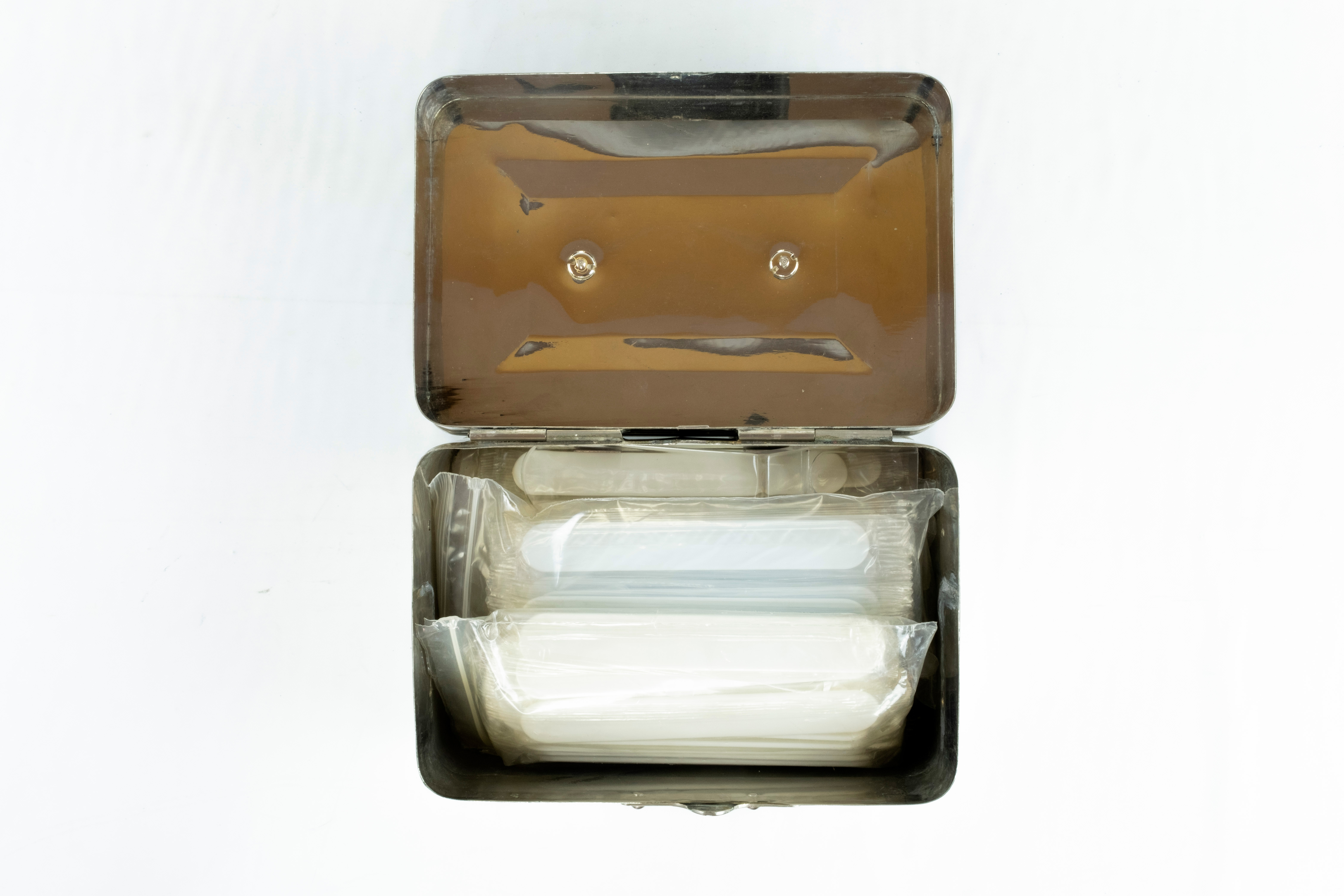 Caja metálica en cuyo interior hay un gran número de depresores de lengua de plástico blanco y uno transparente distinto de los demás empaquetados en bolsas individuales y en grupo. 17 de ellas con la marca inscrita “Anginum Jarabe”.