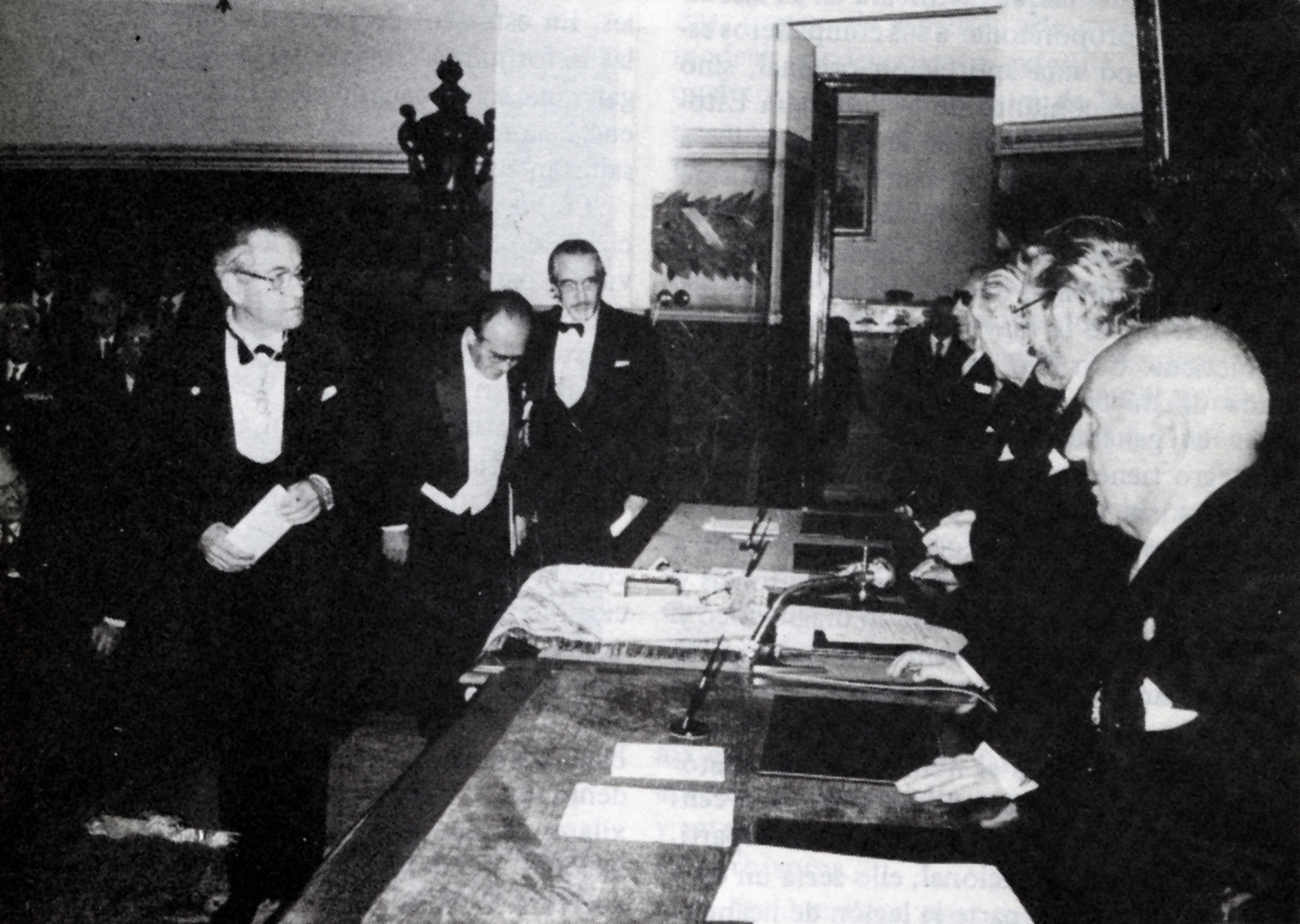 El nuevo Académico de Número de la Real Academia Nacional de Medicina, Prof. Luis Calatrava Páramo, en el momento de su entrada en el salón de actos de la Corporación acompañado de los Académicos Fernábdez-Cruz y Bravo Oliva. Le reciben en la mesa presidencial el Prof. Bermejillo, Presidente de la Academia, el Prof. Vian Ortuño, Rector de la Complutense, el Dr. Negroni, Presidente de la Academia de Medicina de Argentina, y los Profs. Obdulio Fernández y Valentín Matilla.