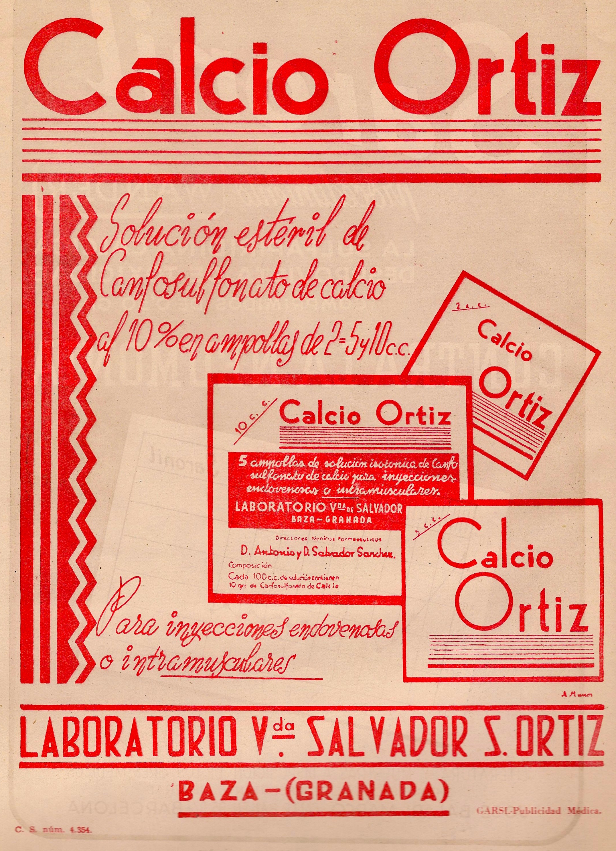 Calcio Ortiz. Canfosulfonato de calcio, Ampollas. Laboratorio Vda Salvador S. Ortiz. Baza. Granada. Publicidad aparecida en la revista Gaceta Médica Española. Año 18, número 2, 1944.