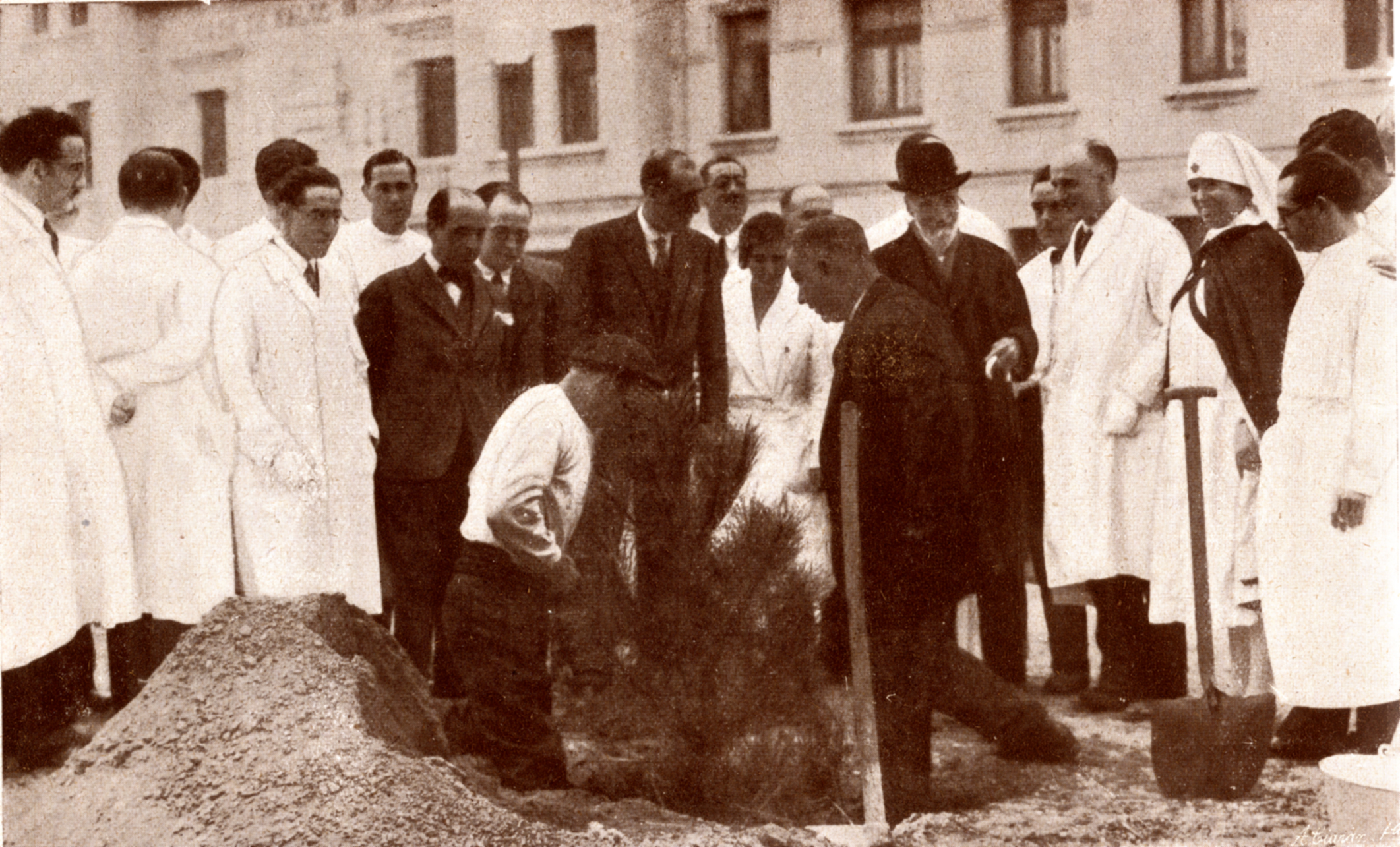 Siguiendo una costumbre tradicional de la familia, el señor Marqués de Valdecilla efectúa por su mano la plantación de un pino en la Fundación que llevará su nombre. Gaceta Médica Española, 44, May 1930