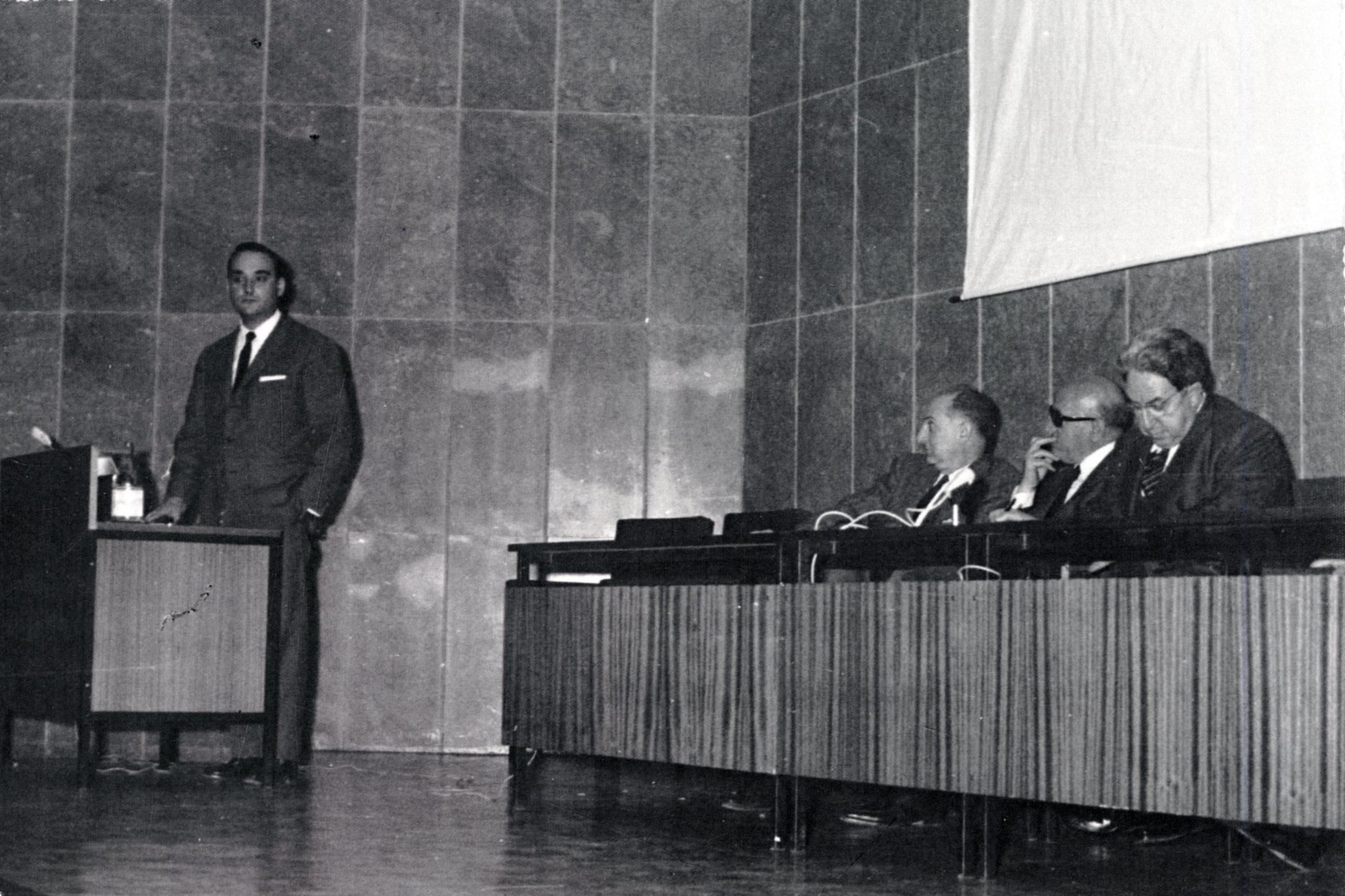 Conferenciante : Dr. Enrique Casado de Frías. En la mesa, úlitimo a la derecha, Prof. Cuadrado (Catedrático de Patología Quirúrgica de Salamanca).