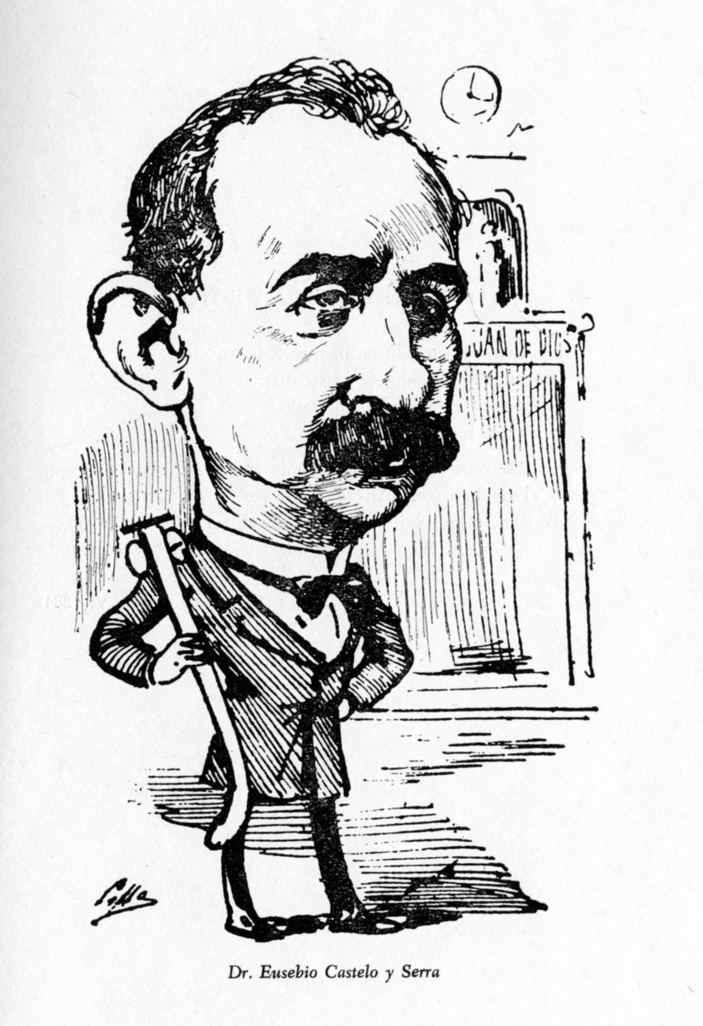 Caricatura del Dr. D. Eusebio Castelo y Serra (1825 – 1892), por Cilla, sacada del libro del Prof. D. Luís Sánchez Granjel, ‘Biografía de “El Dr. Sangredo” (1883-1884)’, que fue una revista médica del siglo XIX que se subtitulaba “Revista satírica quincenal. Dedicada a los hijos de Esculapio”. Pag. 63.