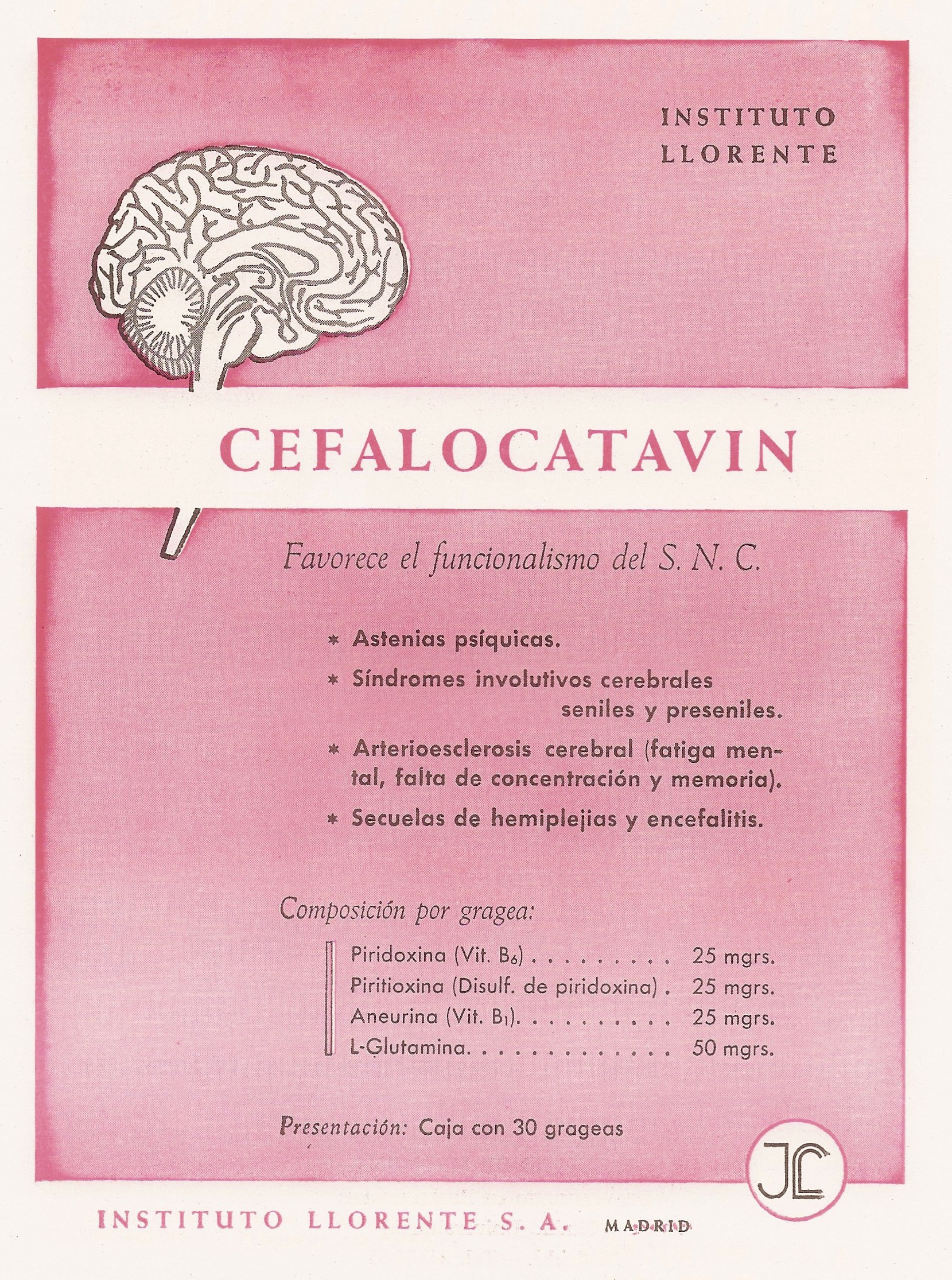 Cefalocatavin. Piridoxina, piritoxina, aneurina y L-glutamina. Favorece el funcionamiento del S.N.C. Astenias psíquicas, síndromes involitivos cerebrales seniles y preseniles. Instituto Llorente, S.A., Madrid.
