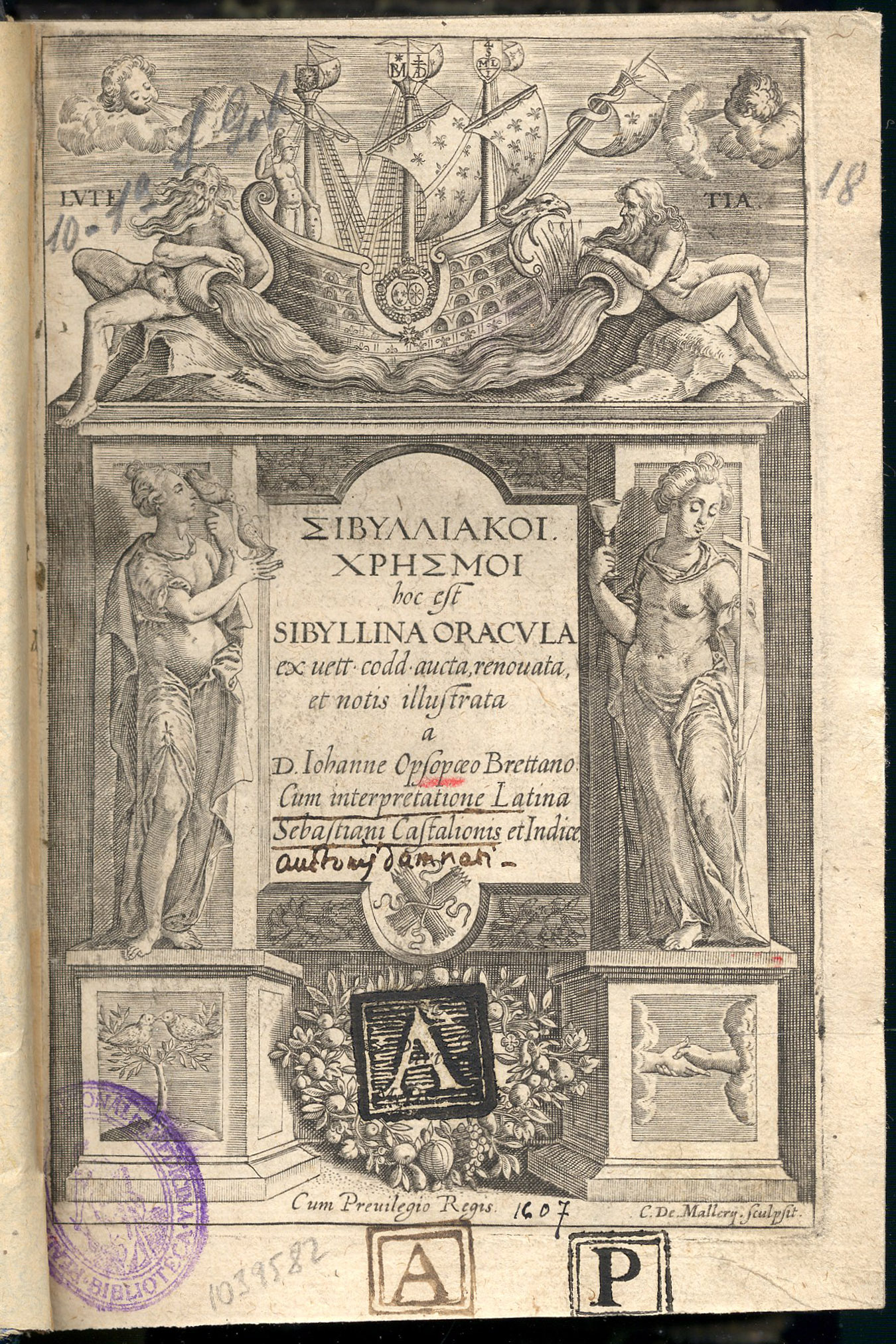 SIBYLLIAKOI Chesmoi : hoc est Sibyllina oracula.. – Lutetia : [s. n.], [1599]. – [16], 524, 73 p. : il. ; 8º [18 cm.]. – Hol.