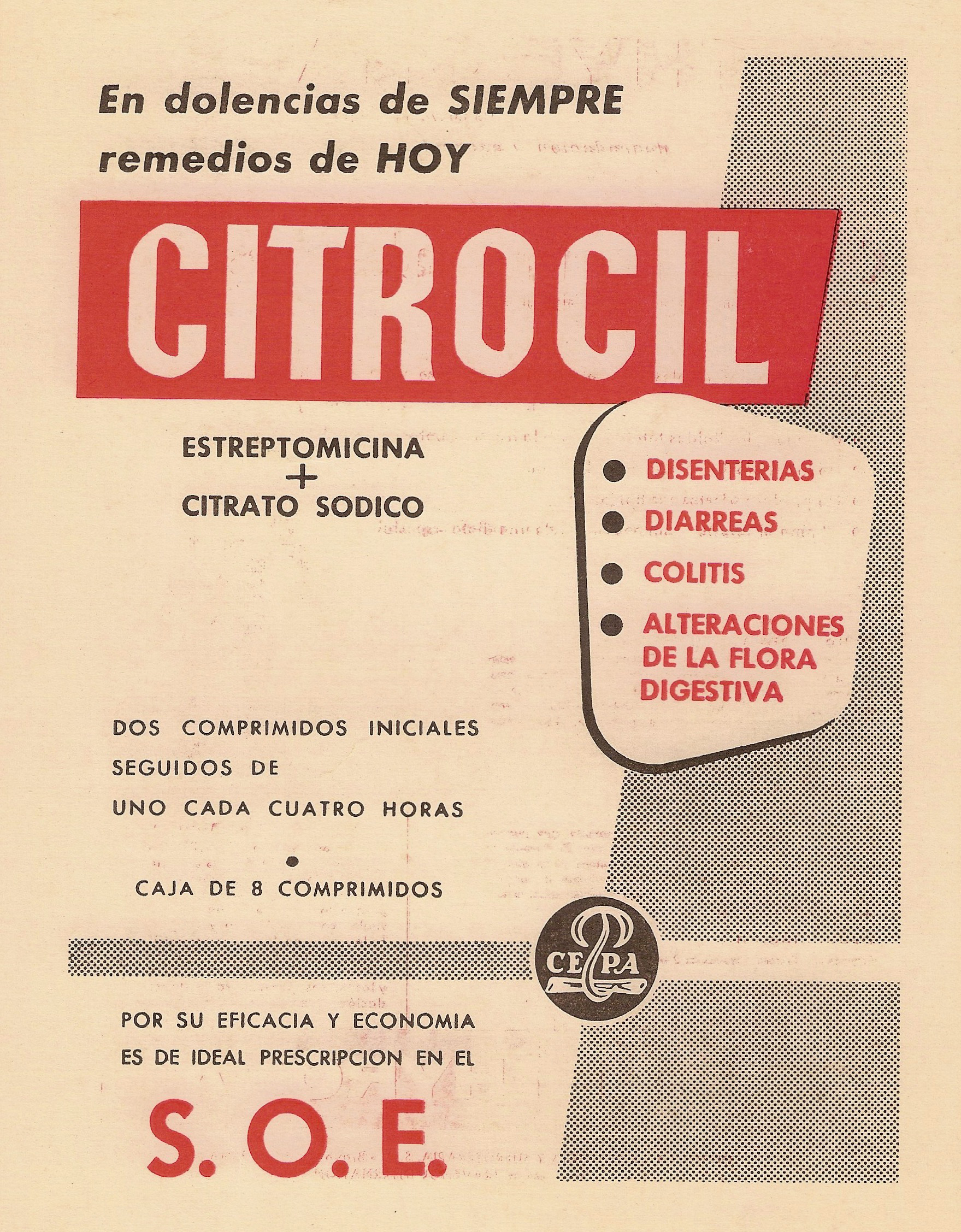 Citrocil. Disenterías, diarreas, colitis, alteraciones de la flora digestiva. CEPA. Archivos de la Facultad de Medicina de Madrid, 1962.