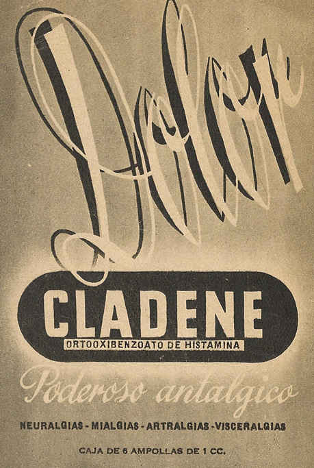 Cladene. Ortooxibenzoato de histamina. Poderoso antiálgico. Dolor. Instituto Farmacológico Latino. Madrid. Publicidad de los años 40 (siglo XX)