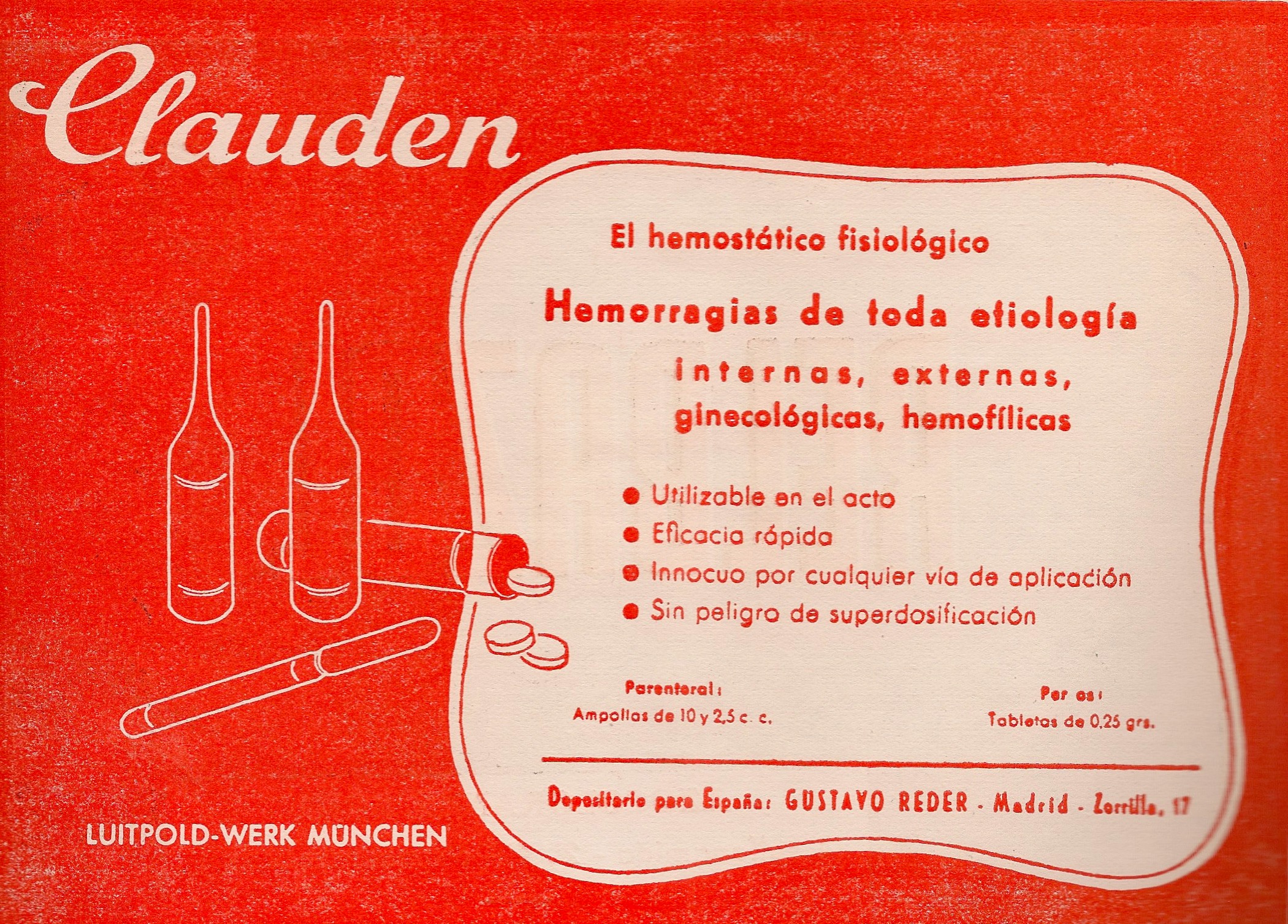 Clauden. Hemostático fisiológico. Hemorragias de toda etiología. Gustavo Reder. Madrid. Publicidad aparecida en la revista Gaceta médica Española. Año 18, número 6, 1944.