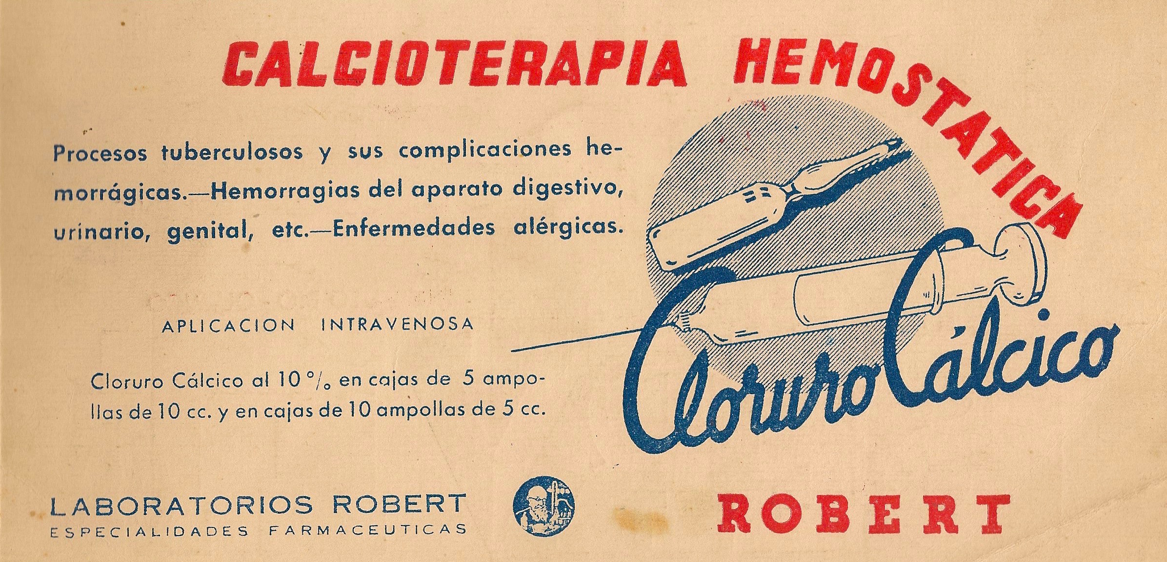 Cloruro cálcico. Ampollas. Calcioterapia hemostática. Tuberculosis, hemorragias del aparato digestivo, enfermedades alérgicas. Laboratorios Robert. Publicidad aparecida en la portada de la revista Gaceta Médica Española. Año 18, número 1, 1944.