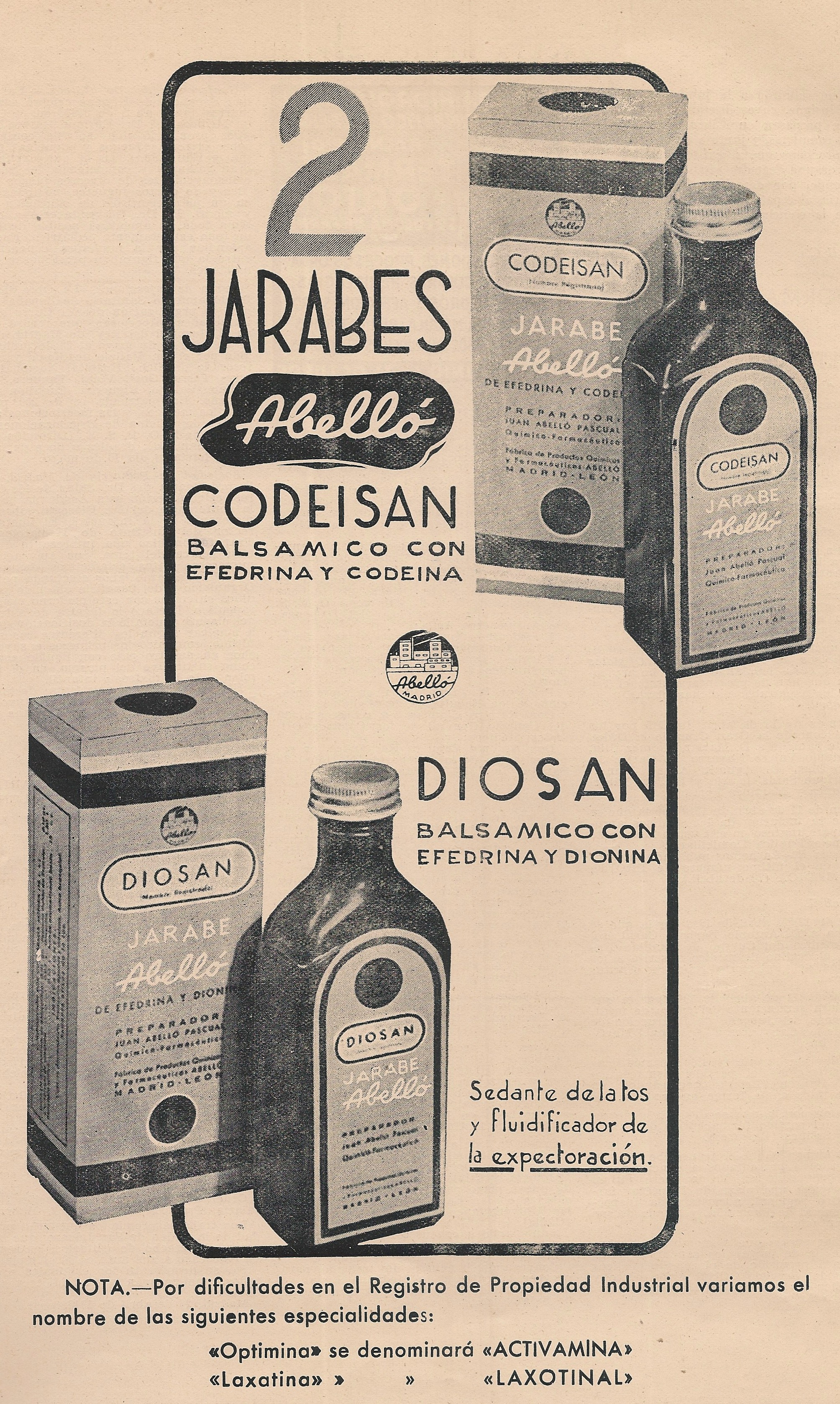 Codeisán: balsámico con efedrina y codeina. Diosán: balsámico con efedrina y dionina. Abolló. Publicidad aparecida en la revista Gaceta Médica Española, año XIX, número 5. 1945.