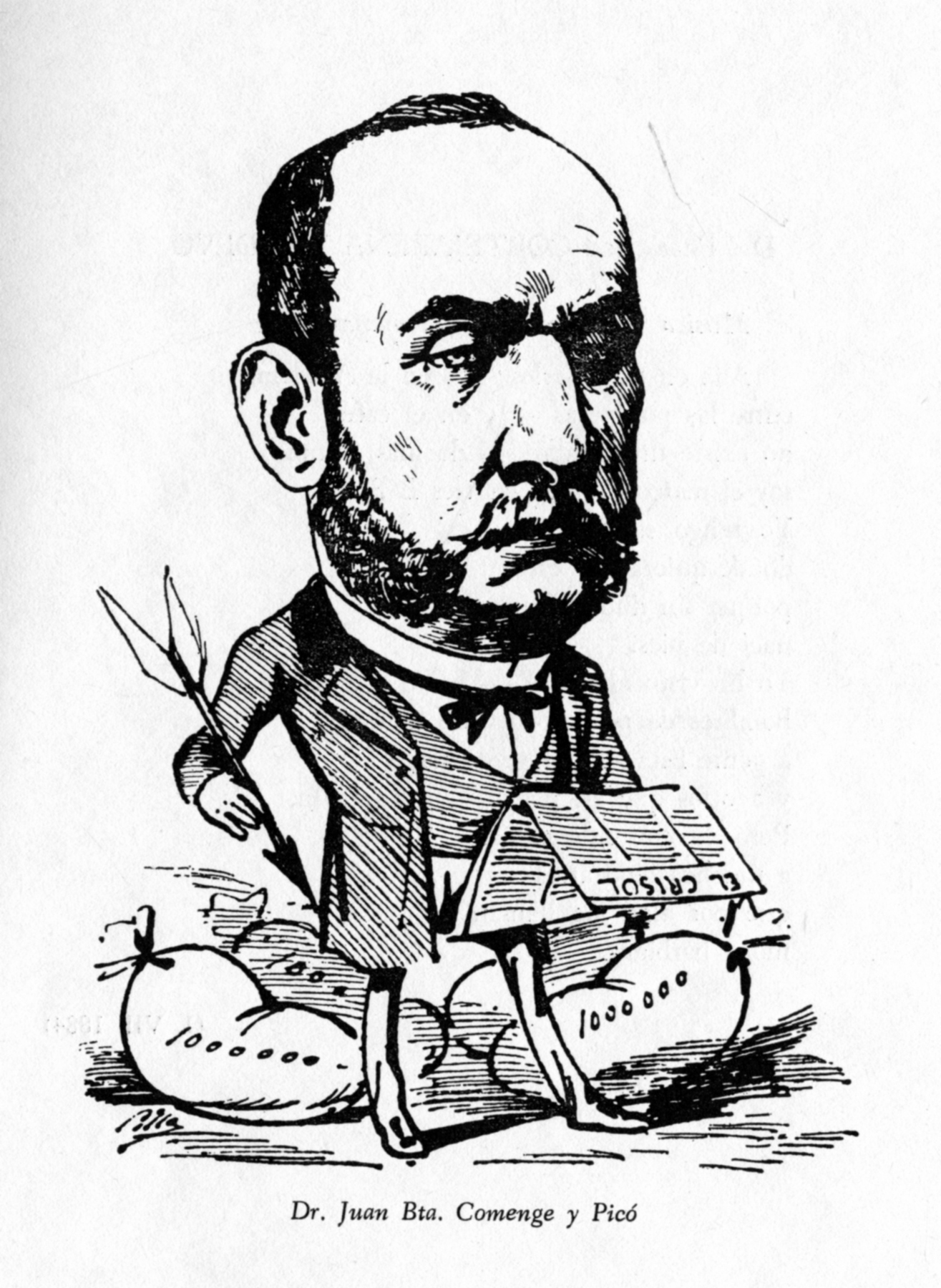 Caricatura del Dr. D. Juan Bautista Comenge y Picó, por Cilla, sacada del libro del Prof. D. Luís Sánchez Granjel, ‘Biografía de “El Dr. Sangredo” (1883-1884)’, que fue una revista médica del siglo XIX que se subtitulaba “Revista satírica quincenal. Dedicada a los hijos de Esculapio”. Pag. 67.