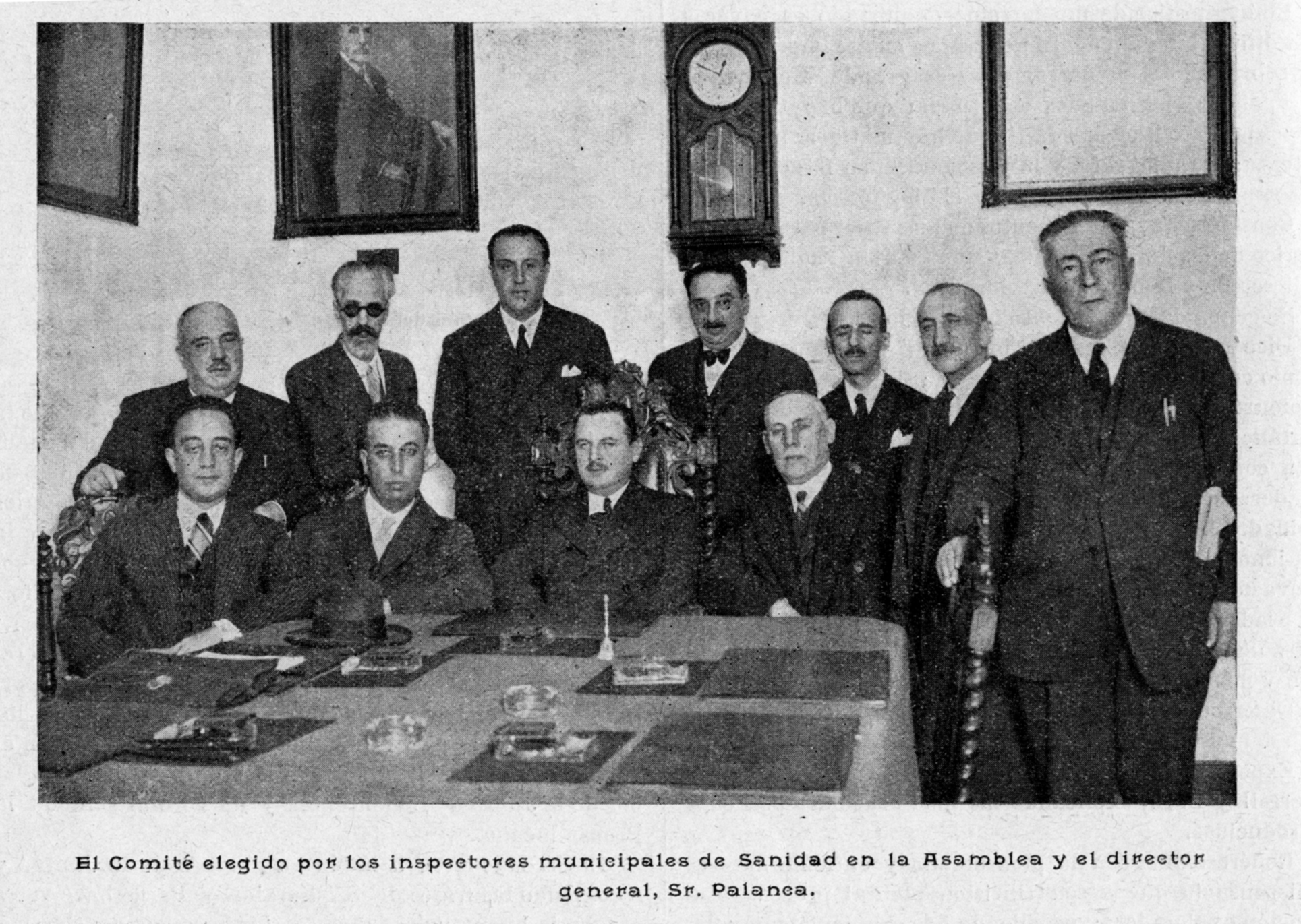 Comite de la Inspección Municipal de Sanidad elegido en 1930, con su Director General el Dr. D. José Alberto Palanca y Martínez-Fortún. Diciembre 1930. El Siglo Médico, T. 86, 1930, pag. 644