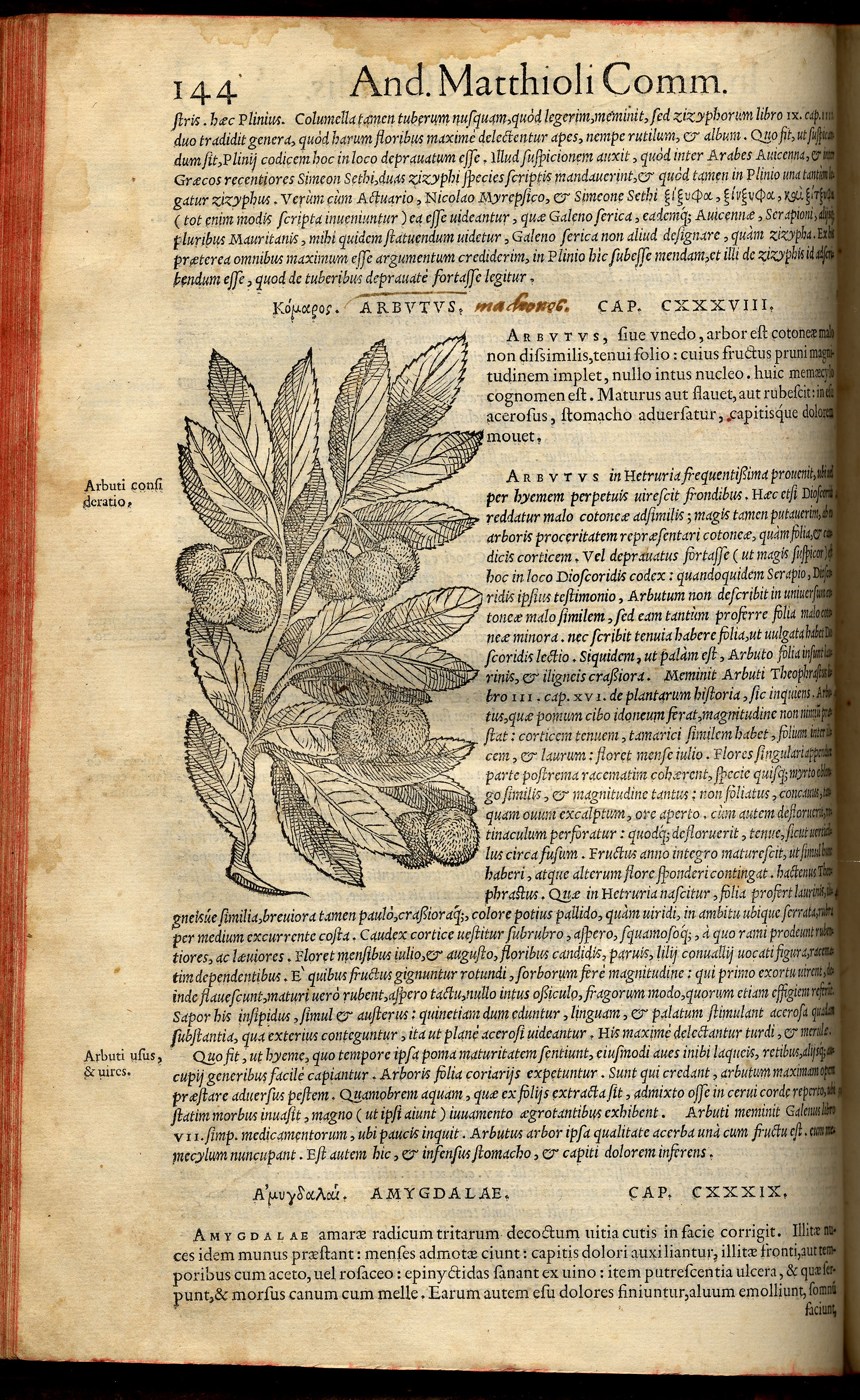 MATTIOLI, Pietro Andrea (1500-1577). – Commentarii… in libros sex Pedacii Dioscoridis… – Goritiae : Iean d’Ogeralles, 1554. – [36], 694 p. : il. ; Fol. (30 cm). – Pasta.
