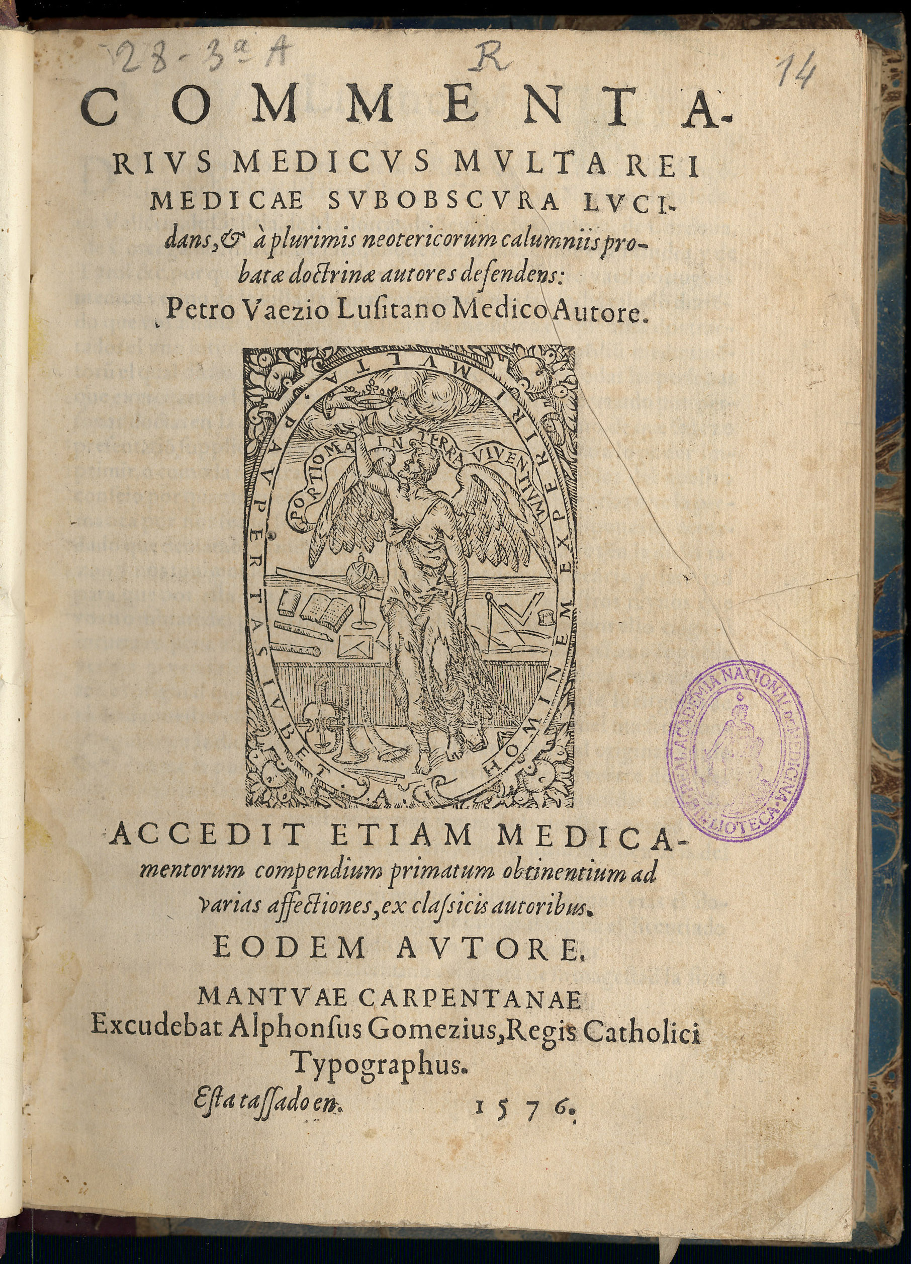 VAEZ, Pedro. — Commentarius medicus multa rei medicae suboscura lucidans…– Mantuae Carpetanae : Excudebat Alphonsus Gomezius, 1576. — [4], 168 h. ; 4º [22 cm.]. — Hol.